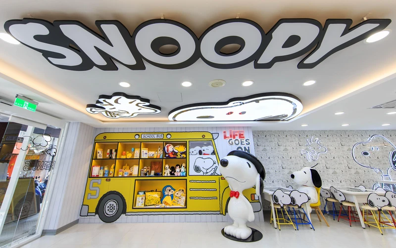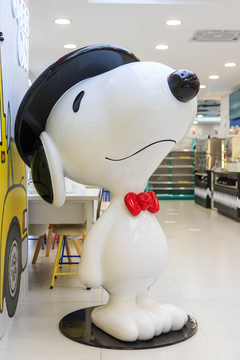 在母店門口可以看到「史努比(SNOOPY)大頭店招」,店內有大型175公分史努比(SNOOPY) FRP公仔迎接,天花板則有史努比(SNOOPY)以及胡士托(WOODSTOCK)的立體造型,花生漫畫(PEANUTS)中經典的大型黃色校車也再門市重現,滿滿滿的史努比實在超療癒。