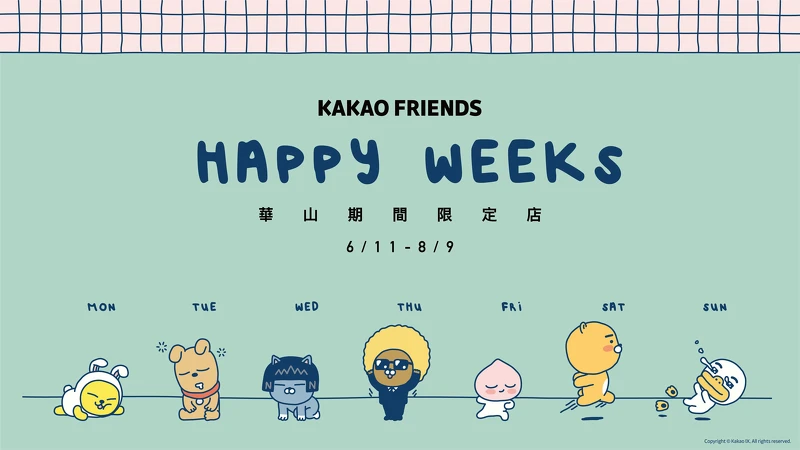 華山期間限定店以HAPPY WEEKS為主題,每天都有不同的心境,不管是Monday Blue還是Crazy Friday,天天都有KAKAO FRIENDS的陪伴。本次主題更推出一系列的超實用文具、3C小物,包含藍芽耳機保護殼、手提文件袋、滑鼠墊、四色圓珠筆、筆記本等,絕對每樣都想買回家!