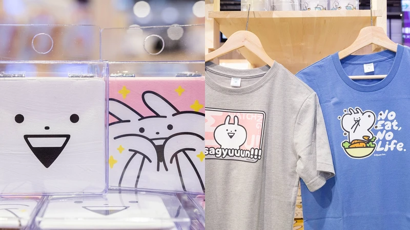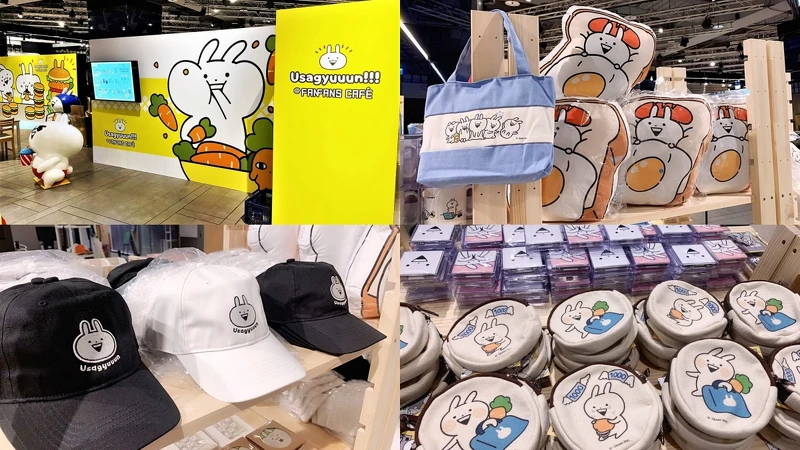 Usagyuuun小突兔聯手FANFANS粉粉打造快閃店與主題餐廳,絕對讓鐵粉失心瘋!共有超過100種商品,包括泰國空運來台抱枕、30多款獨家授權首賣新品,實用的方鏡、防水杯套、吸水杯墊、布章、帽子、T恤等應有盡有,上面更因貪吃個性,有流口水、荷包蛋、漢堡圖案,每天都給你滿滿活力。