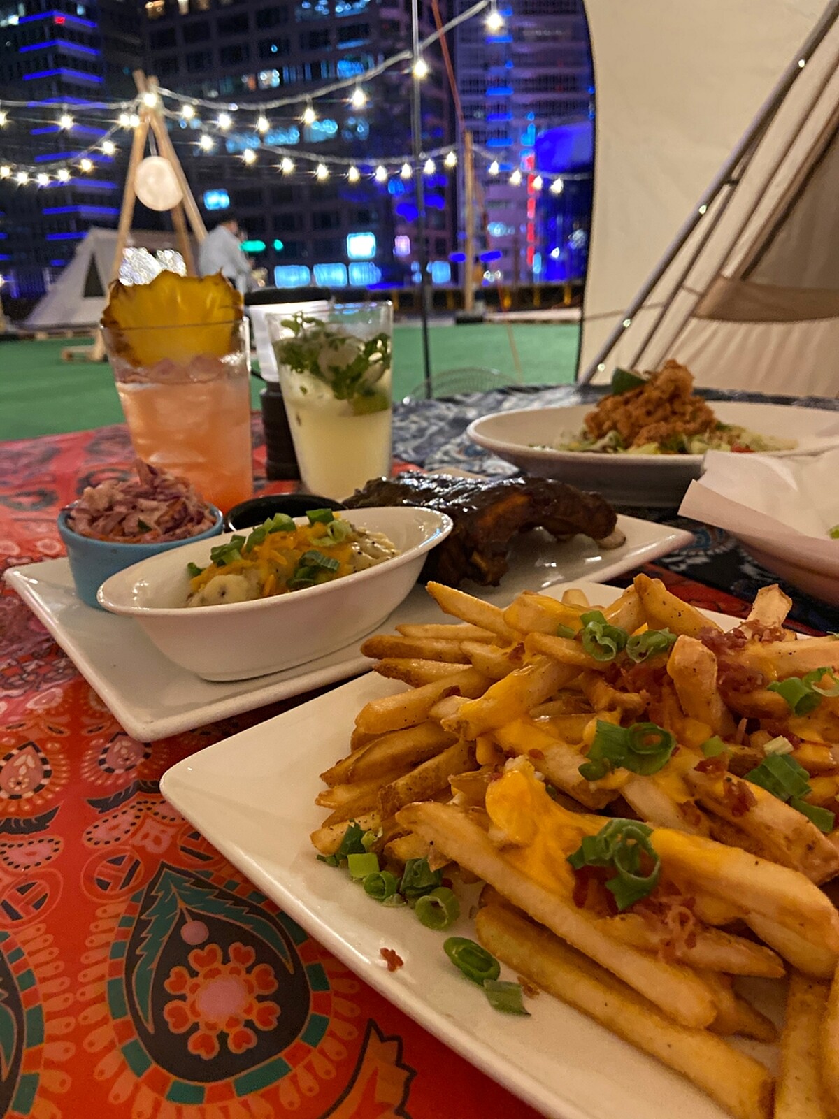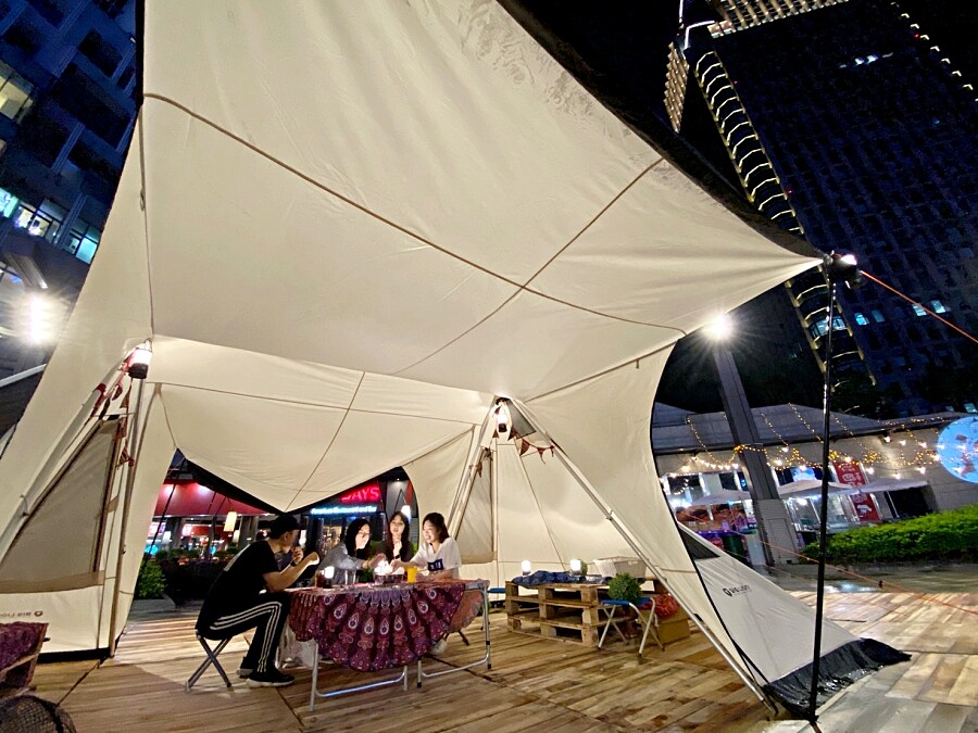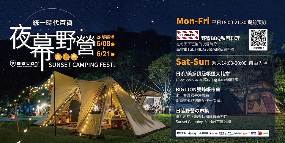 隨著疫情解封,下班、放假不如就出門透透氣,位於信義區的統一時代百貨將帳篷結合私廚料理,讓奔波於都會區的民眾們可以就近紓壓,在百貨公司便能體驗野營樂趣。平日一到五晚上可以在BIG LION雙峰帳裡面享用TGI FRIDAYS的「豪華野營包廂料理」,還能以599元暢飲六款調酒。不論是2人甜蜜時光或4人好友閨蜜聚會都很適合。