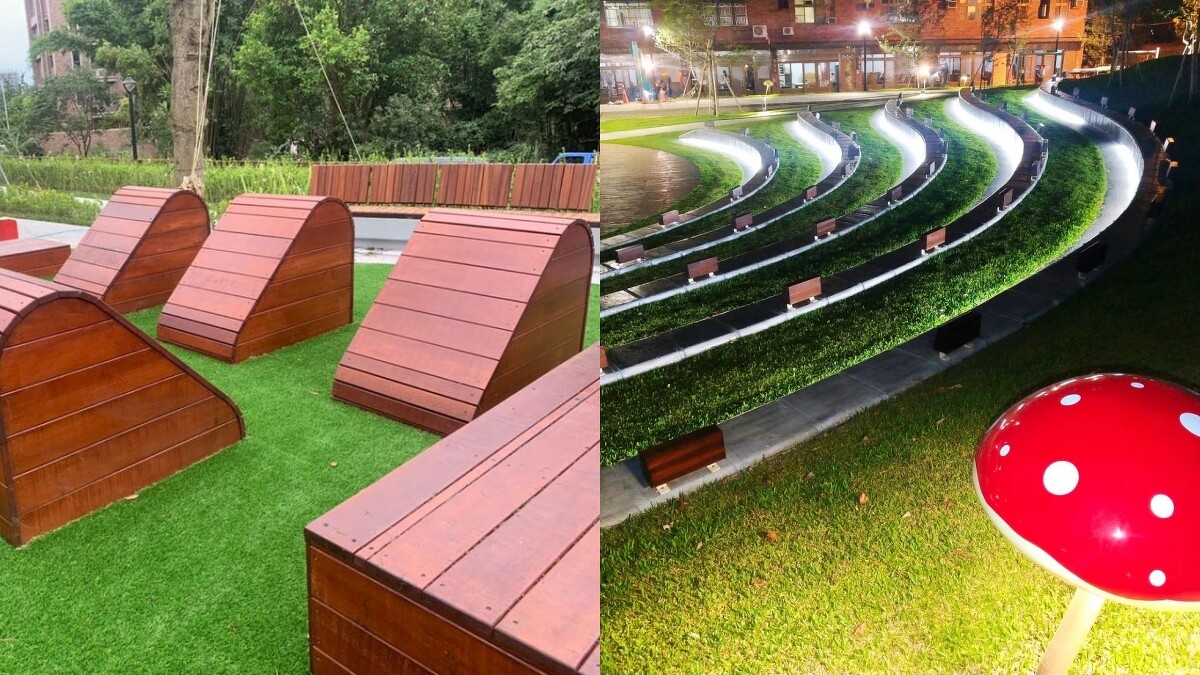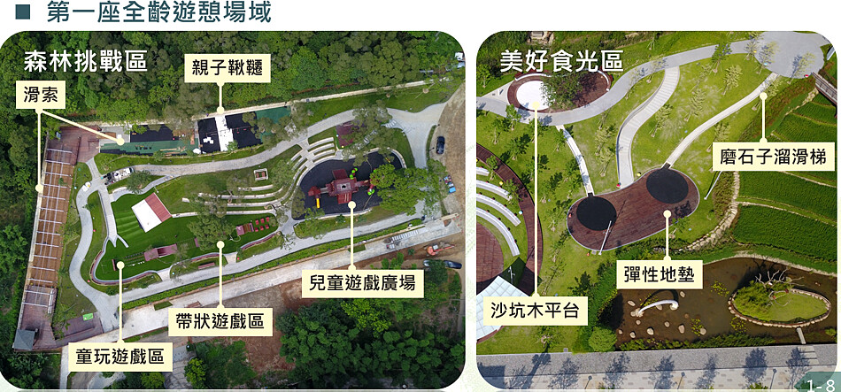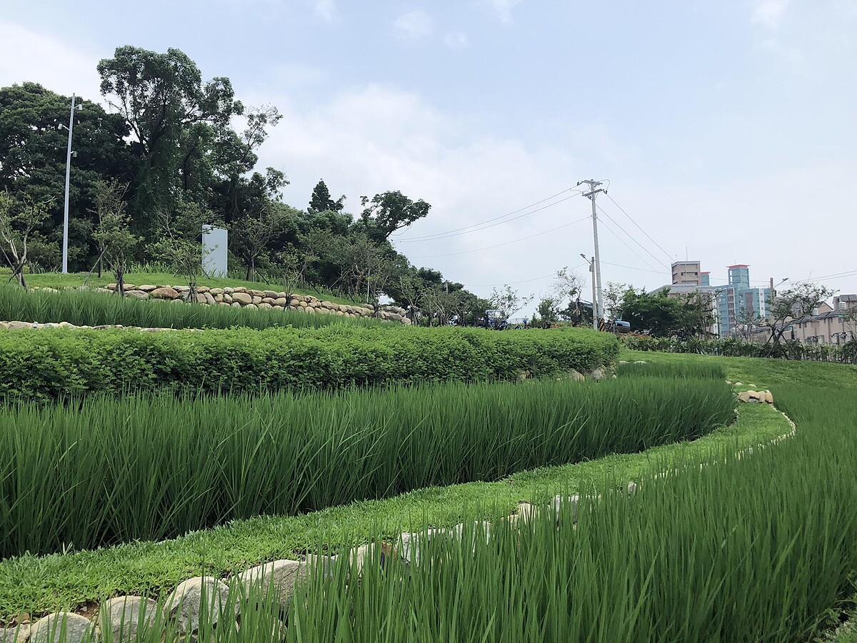 總共規劃三大區域,其中「生態梯田區」及「美好食光區」保有自然環境的水梯田、具教育意義的水撲滿及生態池,散步之餘也能了解當地文化。小朋友、年輕人喜愛的磨石子溜滑梯、遊戲沙坑及戲水池也都沒少,夜晚更有戶外蚊子電影院及音樂劇場,入夜後依然不減興致。