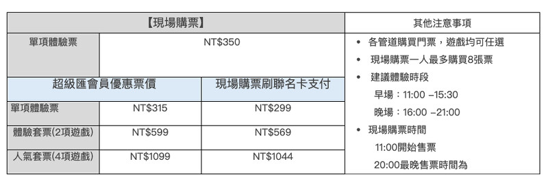 單次體驗票價為350元,若從KLOOK線上售票或宏匯超級匯會員身份,則能享有優惠價,另有2項、4項套票優惠,讓情侶好友、一家大小都能共同感受身歷其境的刺激感受。