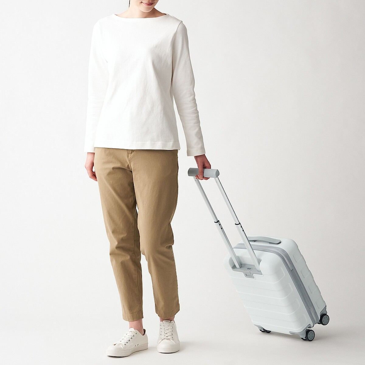 承襲MUJI無印良品一貫簡約實用設計風格,「四輪硬殼止滑拉桿箱」在2019年11月推出改良款,選用100%聚碳酸酯素材,具有質輕、強度高特性,輕巧又耐用。目前已有紅色、銀色、米色、深灰、深藍、黑色等6色,20L(17吋)甚至在限定門市找得到象牙白、淺藍色與淺黃色。