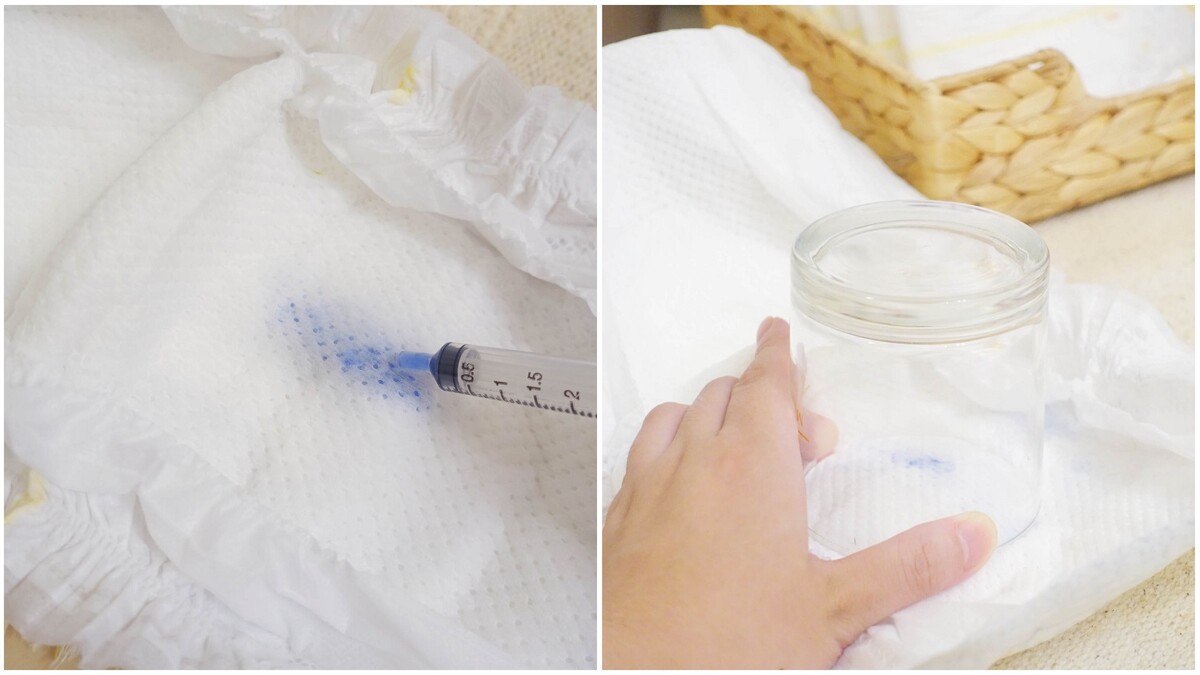 用藍色溫水模擬寶寶溫熱的尿尿,吸收超快速,且吸收完後表層也幾乎看不到藍墨水,不回滲好乾爽。M編實際測試透氣,蓋上玻璃罐可以看到明顯的溼氣快速散出,發現原來熱氣真的會立即散發,讓屁屁完全不悶熱!直達滿分等級的乾爽舒適,讓寵愛的寶寶沒有尿布疹!