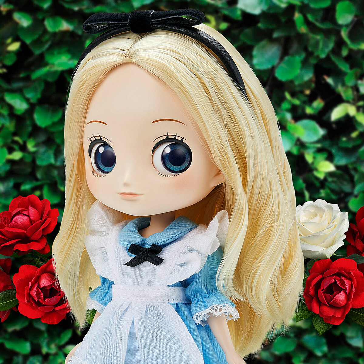 而Q posket Doll全新系列比起公仔更偏向於娃娃,眼睛使用透明材質製造,更具有真實的光澤,還擁有了柔順的長髮,可以幫愛麗絲變化不同的髮型!
