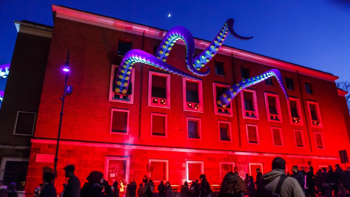 超炫目的《思念是一首歌》由台灣藝術家莊志維創作,藉由向遠方投射的雷射光束,又或是用LED燈照亮寫滿訴說文字與符號的黑盒,呈現奔放情緒卻又無法觸及的思念長尾。來自英國的《章魚入侵》能看到10米長章魚腳霸佔停車場,為深夜增添幾分幽默興致。
