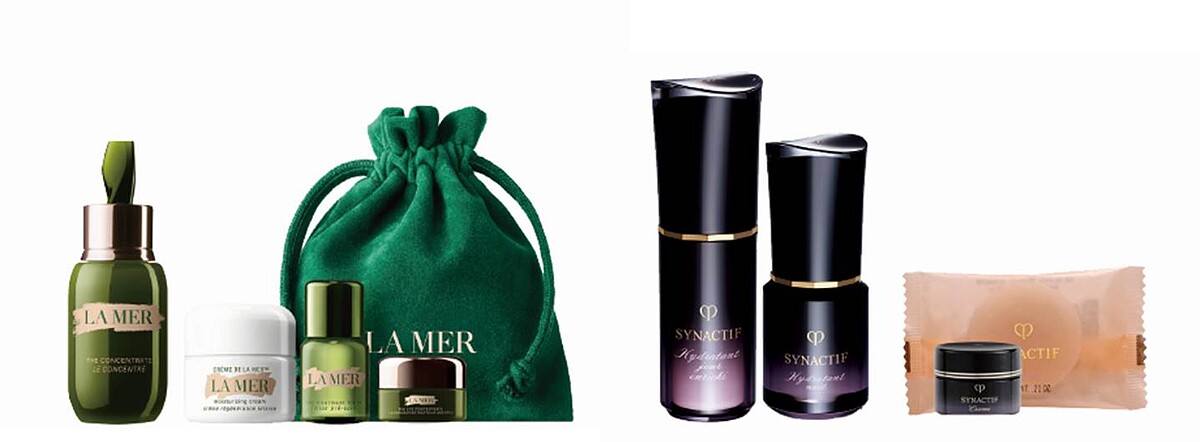 左:排隊夯品LA MER 濃萃雙重修復精華50ml+乳霜15ml+濃萃修復眼霜5ml+濃縮精華露15ml+寵愛束口袋,特價NT16,740元 ,價值NT25,420。右:頂級保養 Clé de Peau Beauté 創.極致日夜組,推薦價NT15,300。