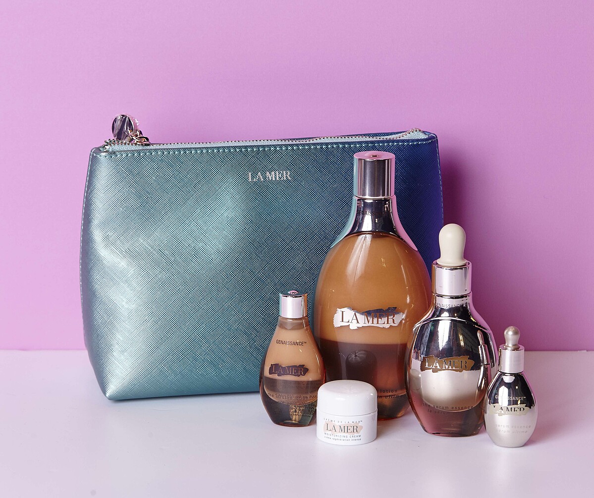 LA MER 創世紀前導精露150ml+原晶極萃30ml+創世紀原晶極萃5ml+創世紀原晶前導精露15ml+乳霜7ml+限量歡慶化妝包,特價NT29,970,原NT39,737。