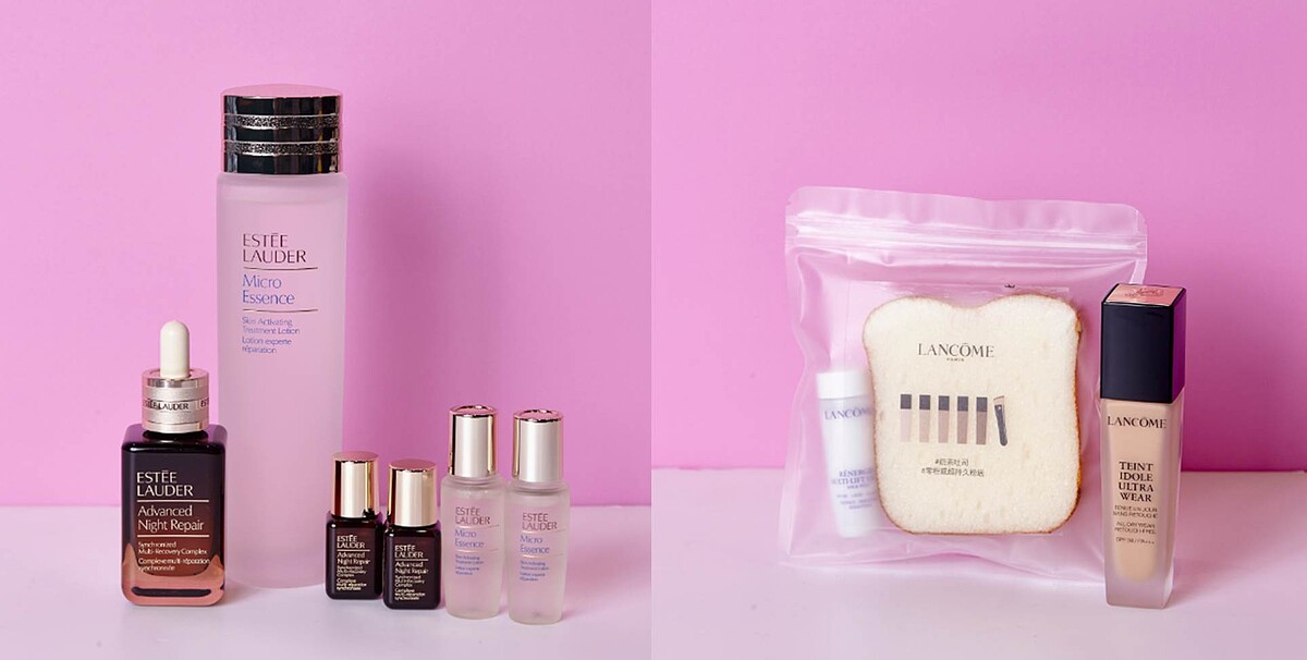 左:雅詩蘭黛年輕雙天后經典組:特潤超導全方位修護露50ml(正貨)+7mlx2+微分子肌底原生露200ml(正貨)+15mlx2,特價NT6,165、原價NT9,484。 右:零粉感超持久粉底液SPF38 PA+++(正貨)或超極光精華水粉底(正貨)+超緊顏白金青春煥亮雪露15ml+奶茶吐司刷具清潔海棉一片 ,特價NT1,800,價值NT2,405。