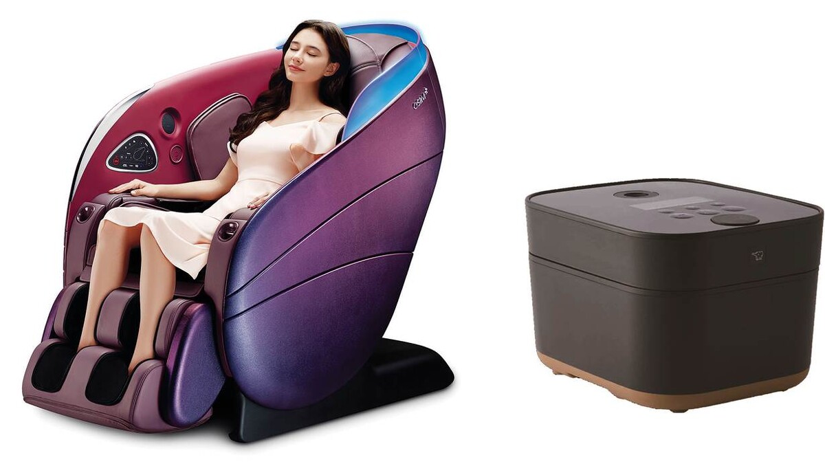 左:旗艦款神搶手 養身椅 ,特價 NT198,000,原價 NT258,000。右: 旗艦款神搶手 象印 STAN.電子鍋,特價 NT15,990,原價NT 21,000。