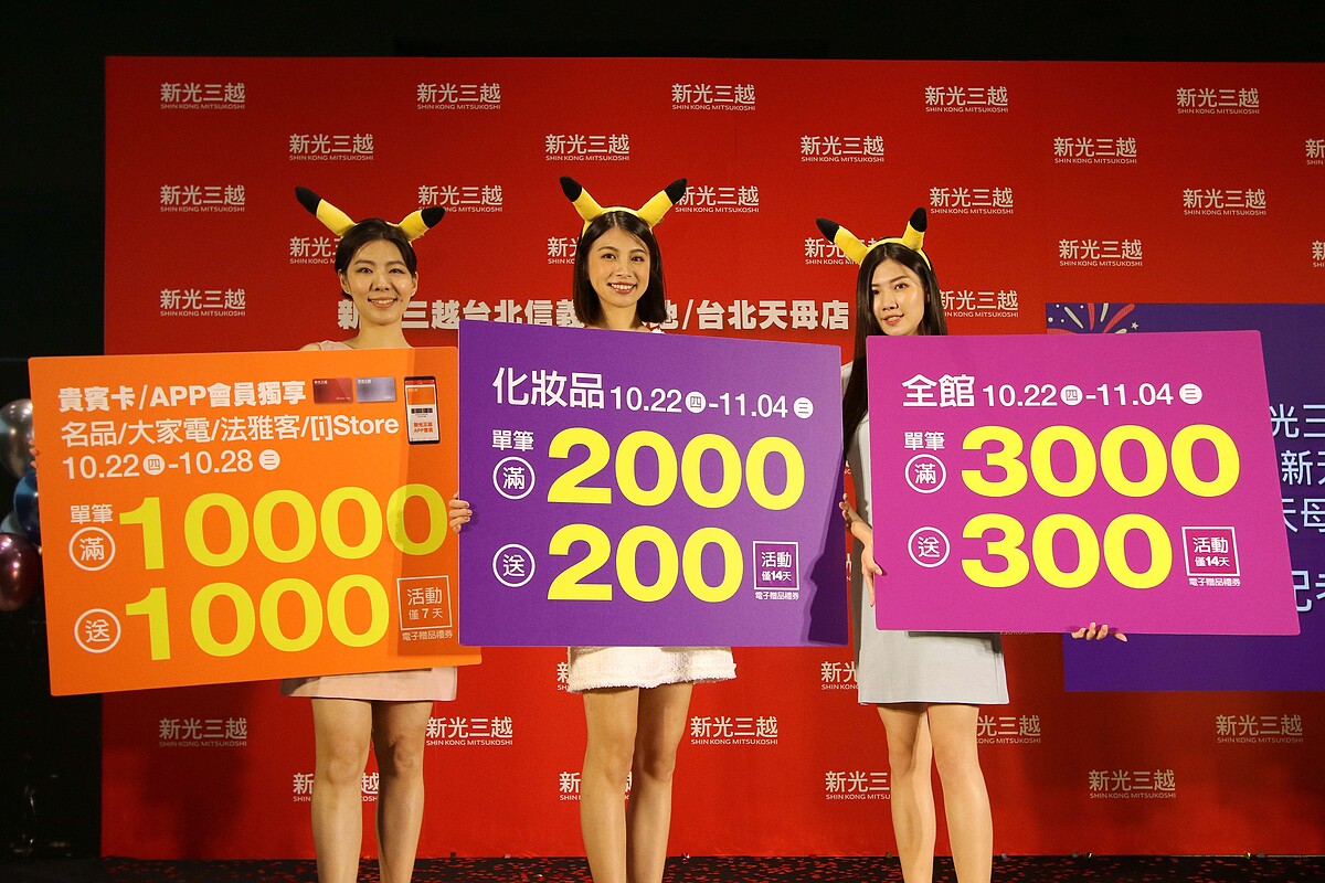 在新光三越台北信義新天地的週年慶期間,還有六米高的皮卡丘氣球會登場,勢必會成為全台拍照打卡新地標,同時還有雌雄雙皮卡丘見面會可以參加,萌到犯規的各種周邊都會在寶可夢快閃店現身,歡迎10月22日起直接來信義商圈抓寶!