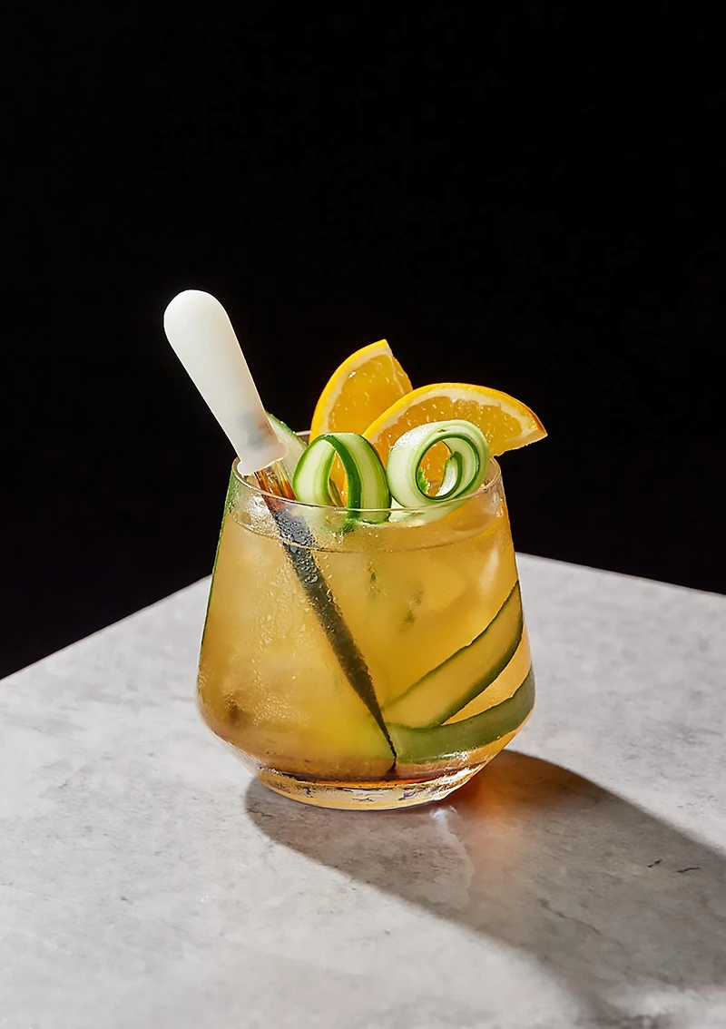 以甘蔗糖渣所製成的蘭姆酒,基酒選擇擁有豐富酒體的黑色蘭姆酒(Dark Rum),搭配自製「巴薩米克醋」等,最後以黃瓜薄片點綴,展現大地的新鮮氣息,品酩時依喜好加入滴管內的醋,讓舌尖感受由酸昇華至微香帶甜,酒體的層次更顯活躍。