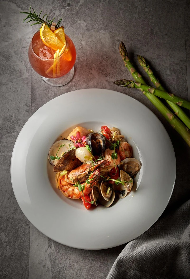 餐點可搭配香氣馥郁高雅的「牛肝蕈菇松露燉飯」,或義大利番茄系列「手工筆管麵佐番茄經典肉醬」,酸香滋味依附麥香筆管麵,為義大利不敗的經典風味。亦可選搭擁有地中海風情菜色「綜合海鮮風味義大利麵」。調酒中的草本香氣伴隨著優雅的氣泡感,讓料理的香氣更加多層次,醇厚的酒香氣息,搭佐品嚐更像是在品味兩道菜餚。