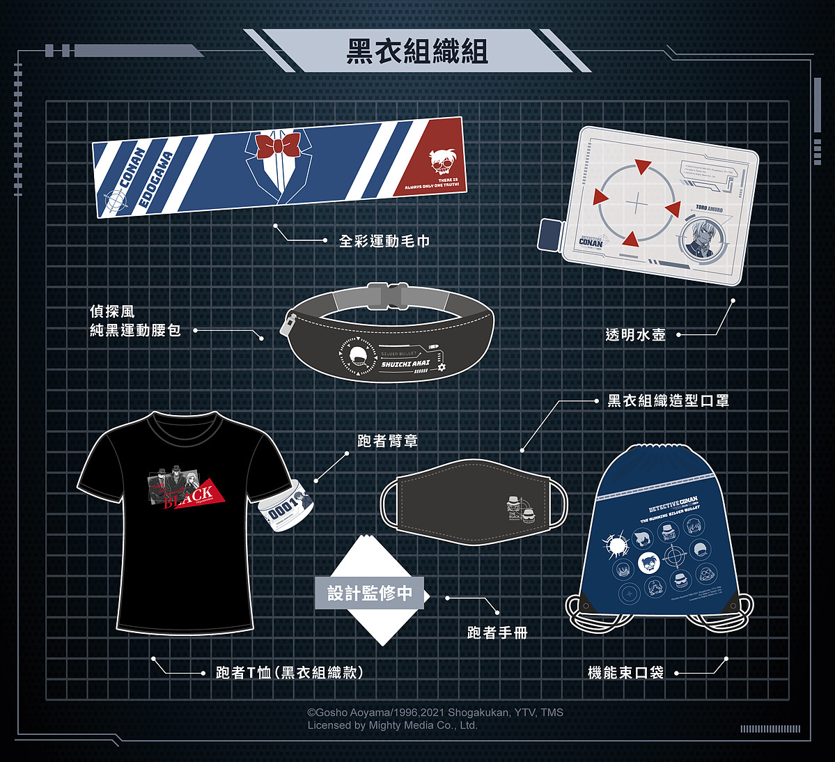有代表偵探方的的「推理入門組」、「運動毛巾組」「透明水壺組」、「鑑識豪華組」,還有代表敵對方的「黑衣組織組」,不同的票組附有特色各異的周邊商品,更會決定跑者在活動當天的「陣營」與相對應的「任務目標」!