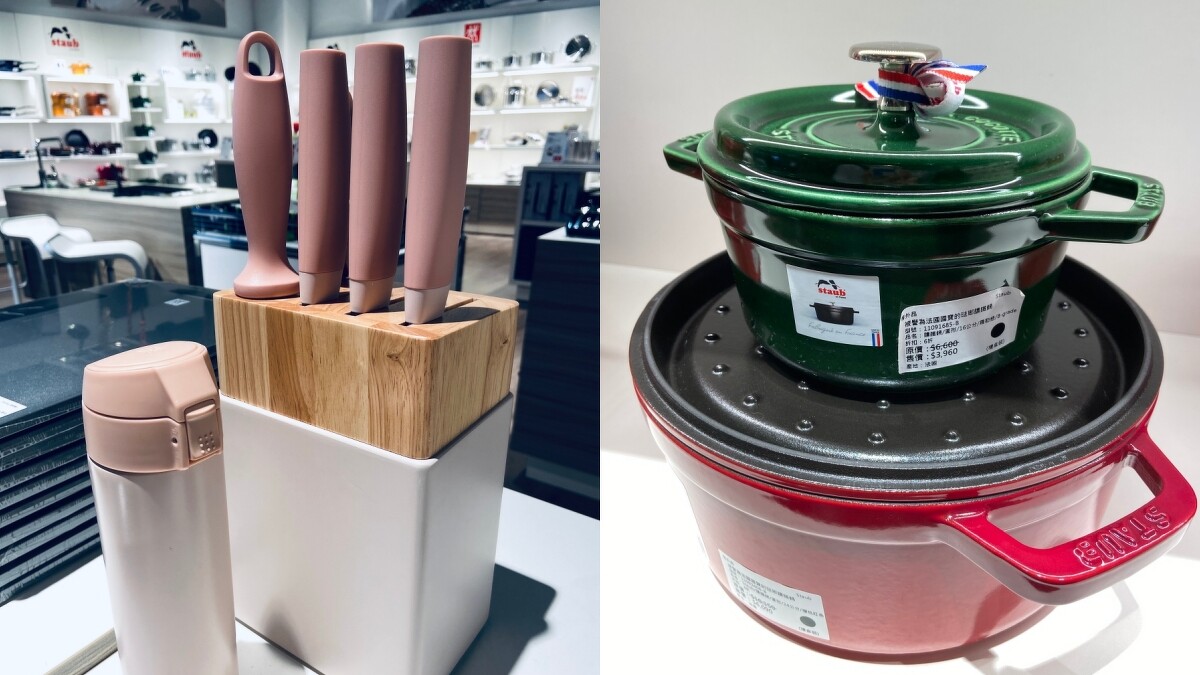 快帶媽媽到德國雙人ZWILLING店面!門口就有超吸睛、限量「蝦粉色」七件式刀座,購買更加贈同色系保溫杯,特價5999元實在太划算。另外店中還有來自法國的Staub琺瑯鑄鐵鍋也值得入手,任何尺寸皆享有一件6折、兩件8折優惠,每個鑄鐵鍋都是手工製作、沈穩色系,是時候該幫廚具升級了!