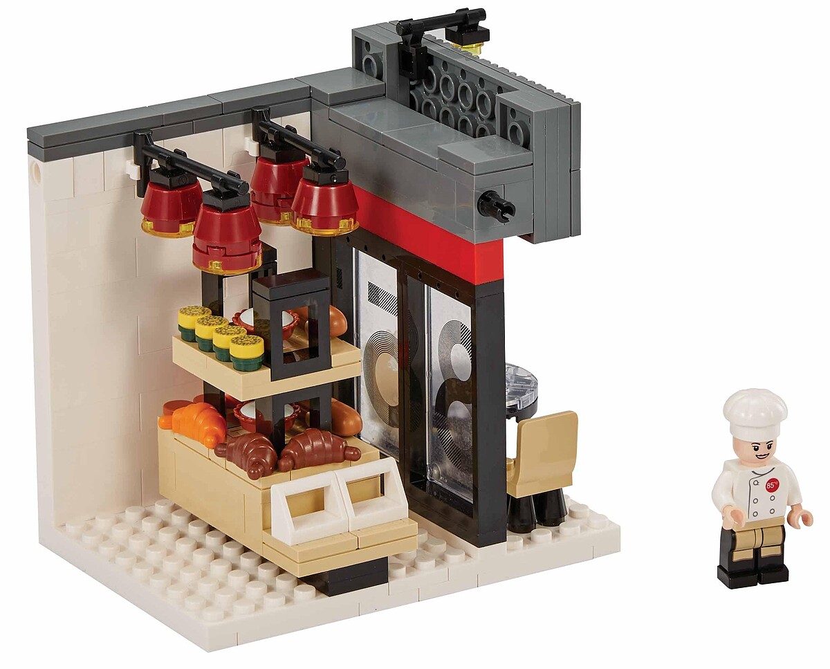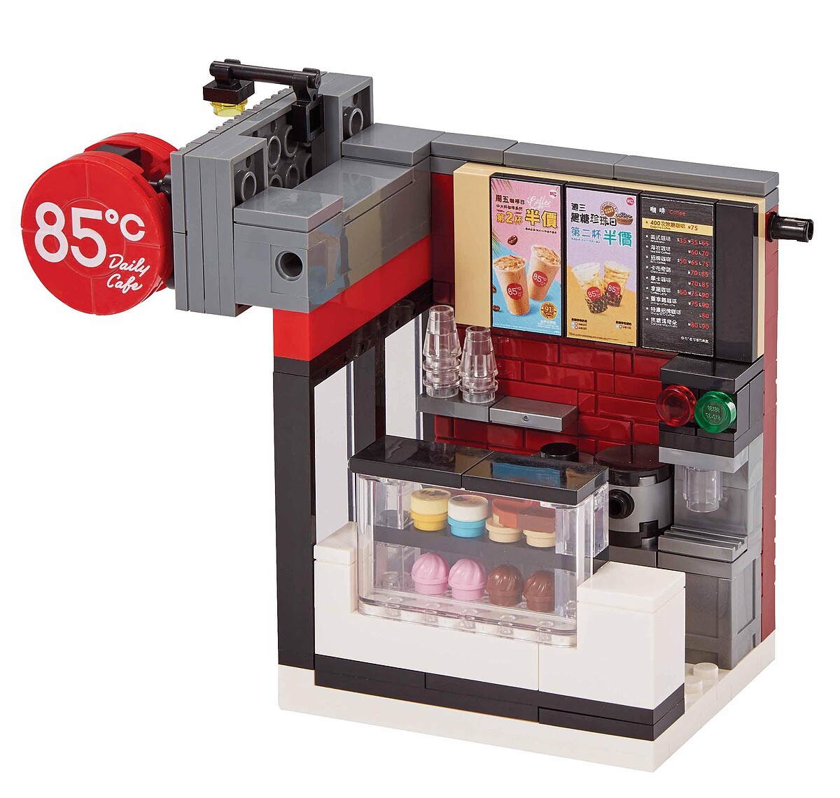 完全依照原店舖主視覺,外觀是黑灰色相間和透明玻璃窗,掛上紅色圓型招牌,迷你又可愛,店內分成蛋糕區,裡面有透明蛋糕展示櫃,櫃台後方是紅色磚牆,上面是海報和產品菜單,這一區共有189片積木。