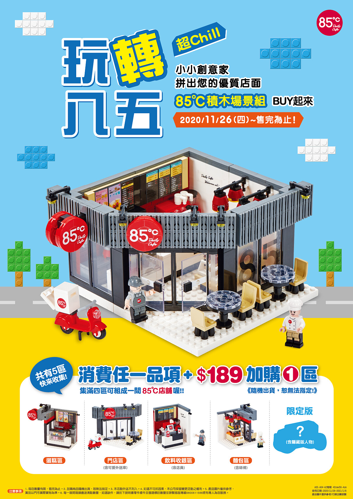 購買方式:到85℃消費任一品項即可加189元加購一區積木。集滿4區即可組裝成一間迷你版的85℃店舖。