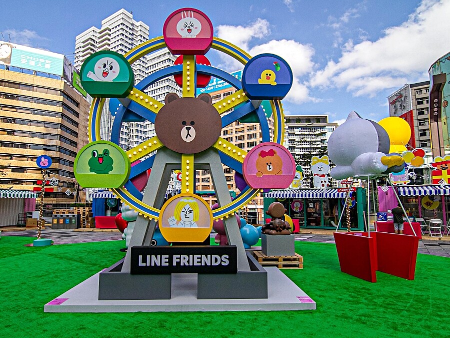 抵達2樓夢廣場後,如貨櫃屋造型的裝置藝術,象徵進入「LINE FRIENDS CARNIVAL 派對時光」的入口,後頭就有5米高的雙面摩天輪、角色咖啡杯、熱氣球及舞台,繽紛又搶眼設計,逼人一秒失去理智!