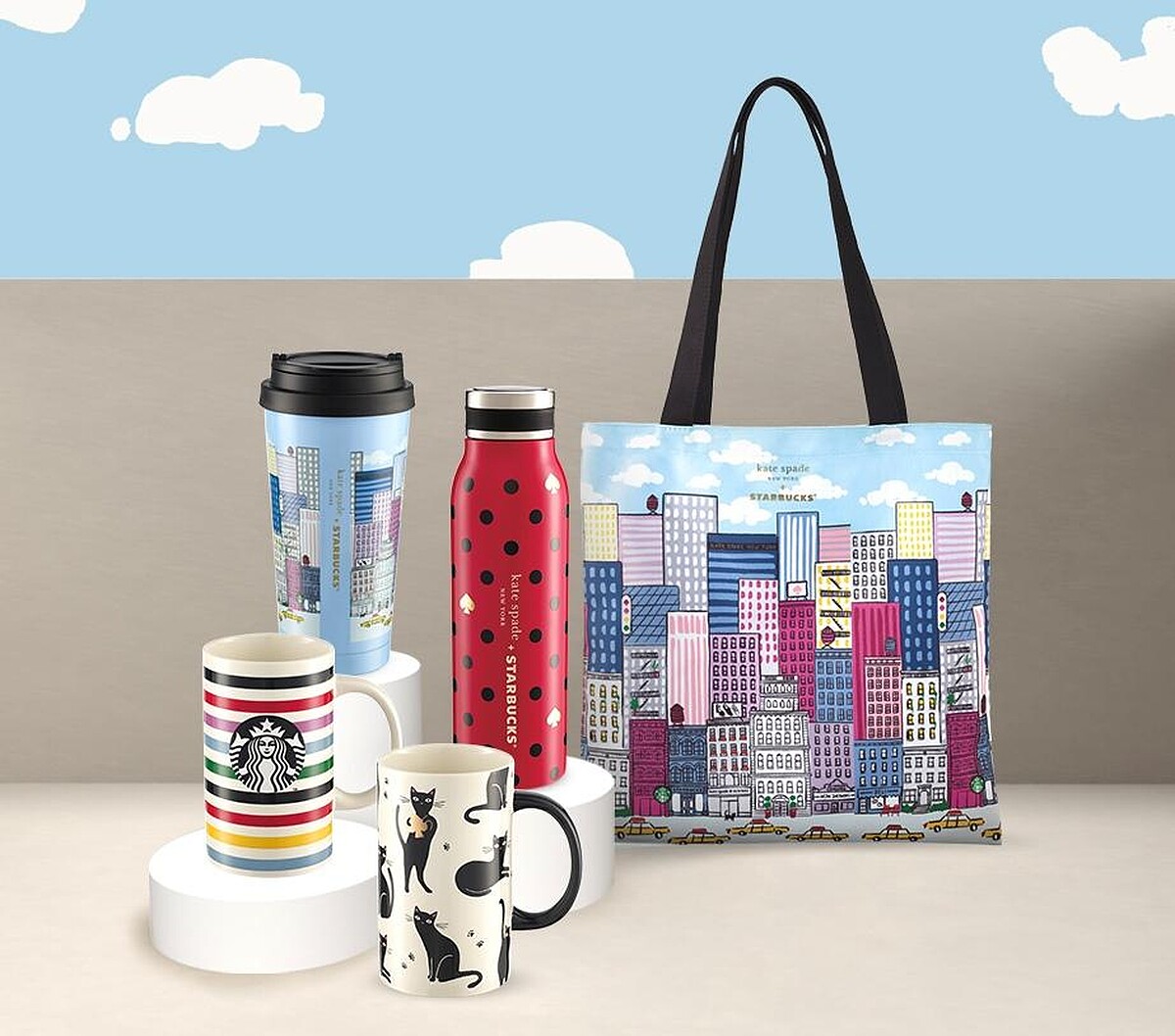 這次星巴克 X kate spade new york以品牌經典的點點與線條,及古靈精怪的貓咪為主題,搭配繽紛鮮明的色調,也呈現出紐約摩登俏皮的品牌調性。