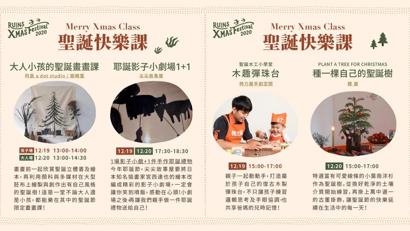 還有適合大小朋友一起參與的聖誕畫畫課、木工小學堂、種聖誕樹等手作課程,為2020聖誕節留下難忘回憶。咖啡館裡還有「閣樓裡的環遊世界電影院」,用第一視角穿梭各國聖誕節街頭,令不能出國的你我都能解解饞。最後一定要到「廢墟酒吧」享受冬日裡的微醺,為年末佳節畫下完美句點。