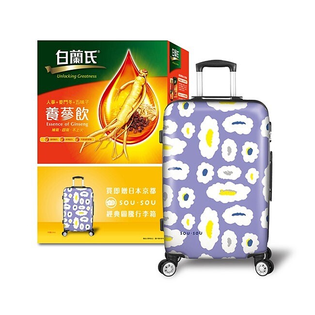 除了全店消費滿額加購活動外,1/10起,凡購買白蘭氏養蔘飲68入,即搭贈「SOU‧SOU」浪漫粉紫花色行李箱。
