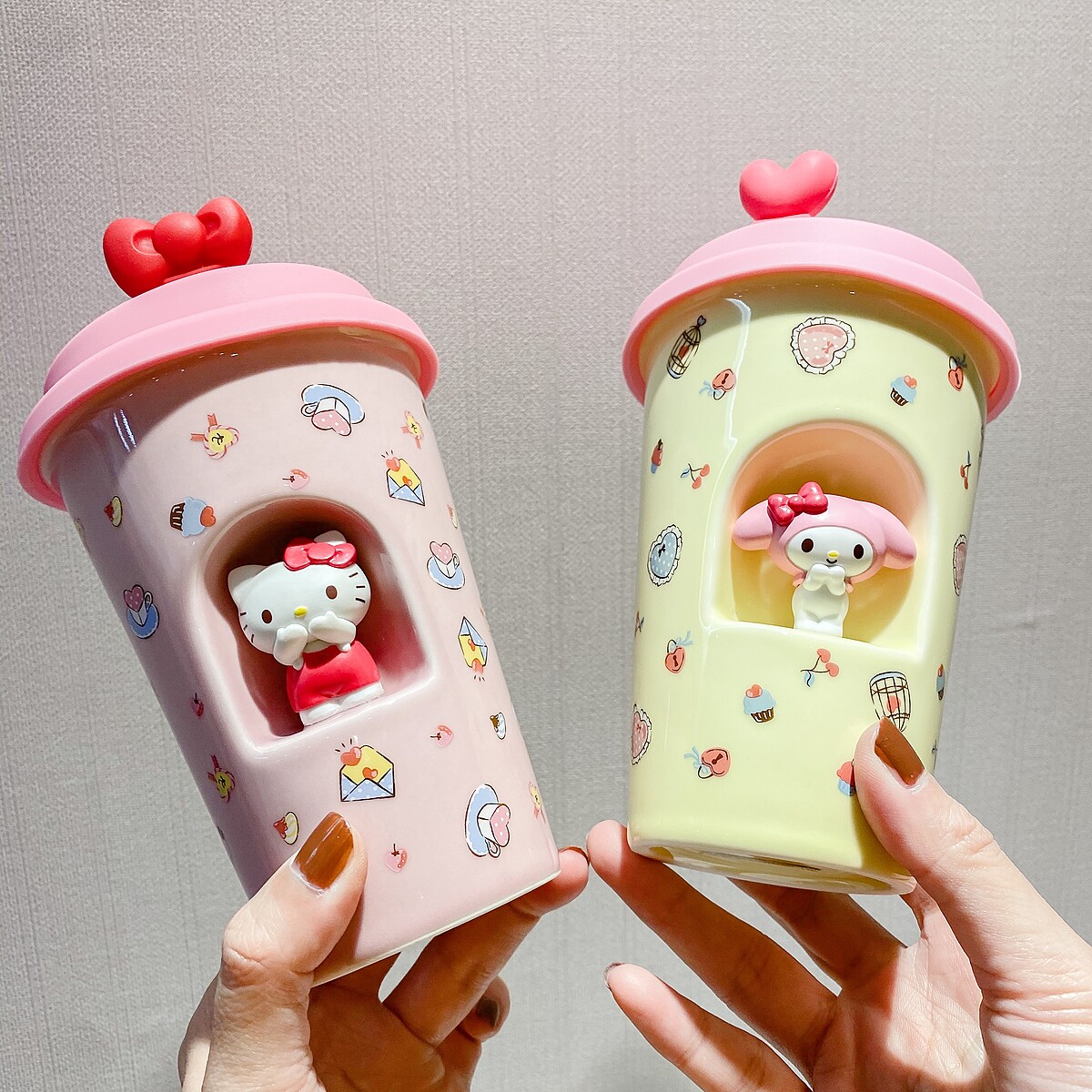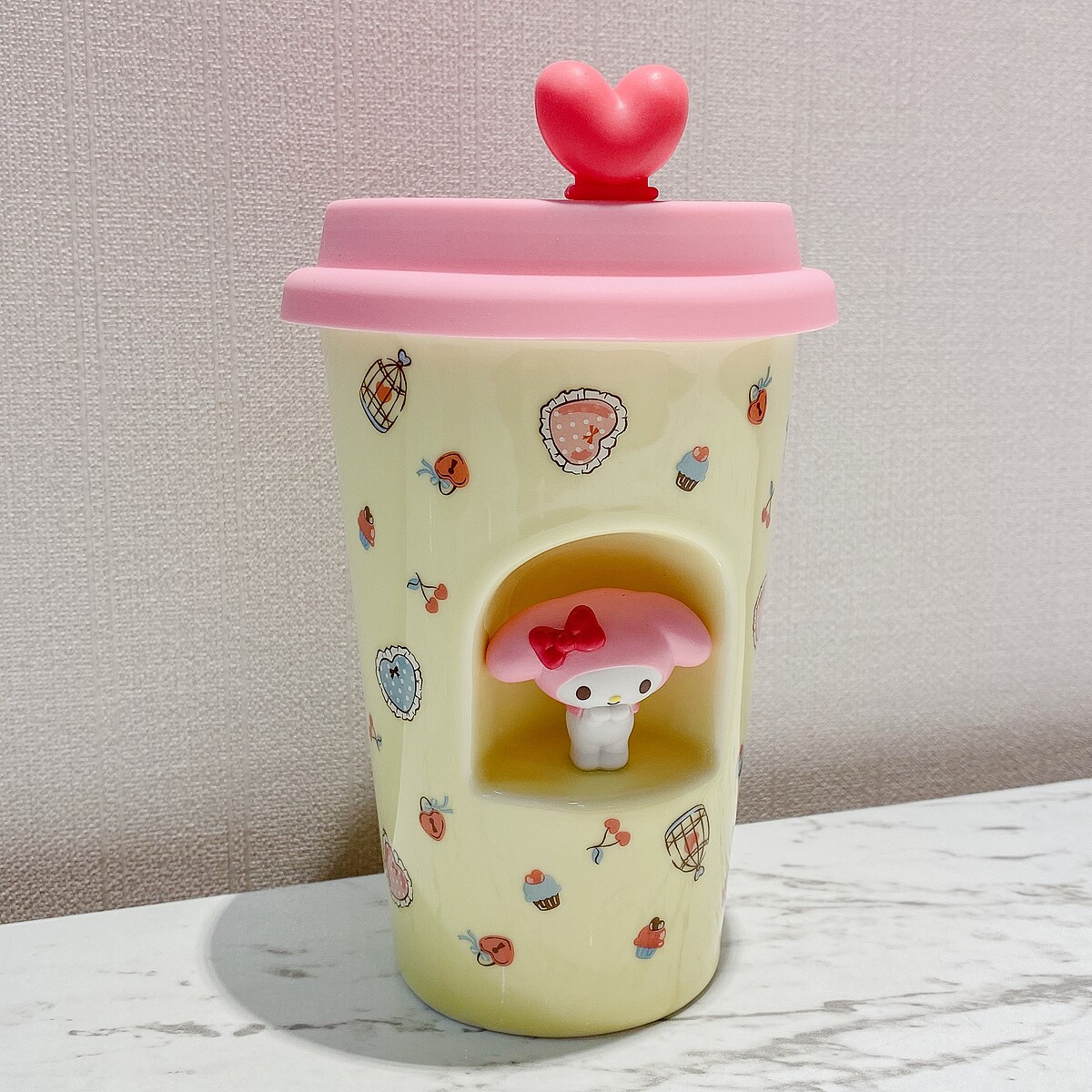 鵝黃色的美樂蒂搭配粉紅杯蓋及愛心造型也非常可愛,容量約400ML的陶瓷杯剛剛好!