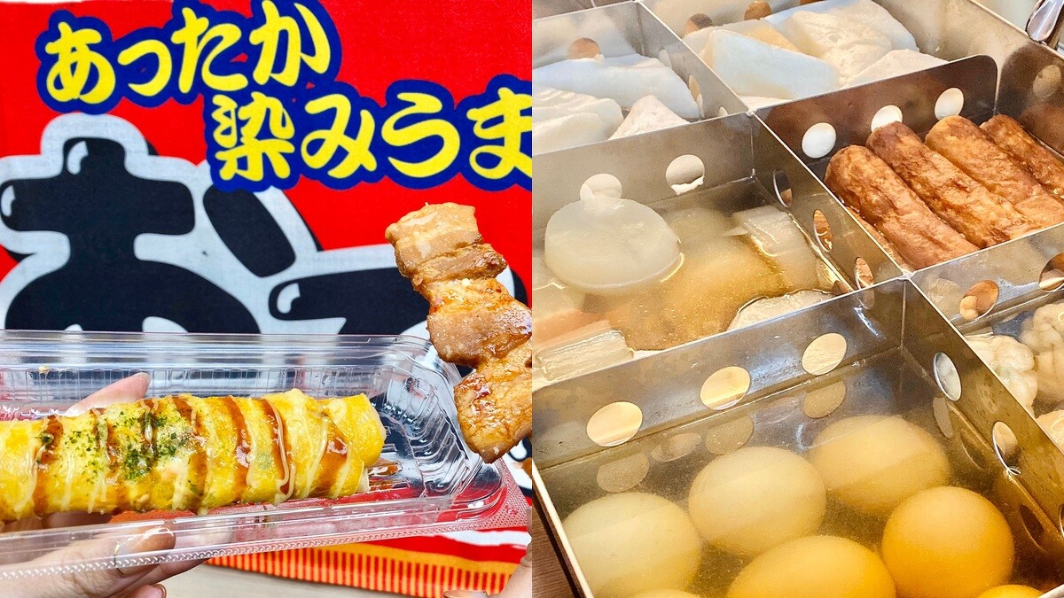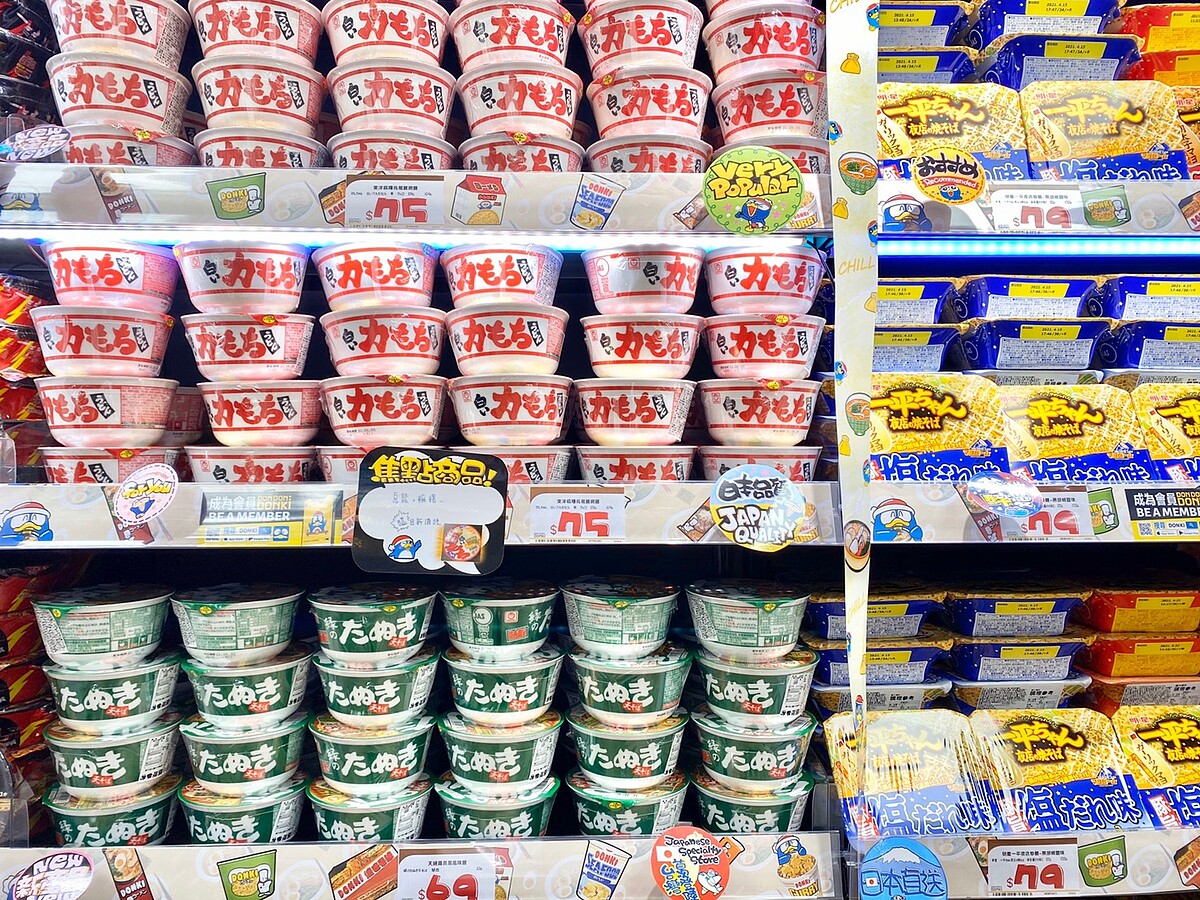 主要擺放各式各樣的驚安特惠商品與結帳區,在店門口外還有販售各式小吃美像是Don Don燒、關西煮、串燒、蜜蘋果等暖心即食商品。