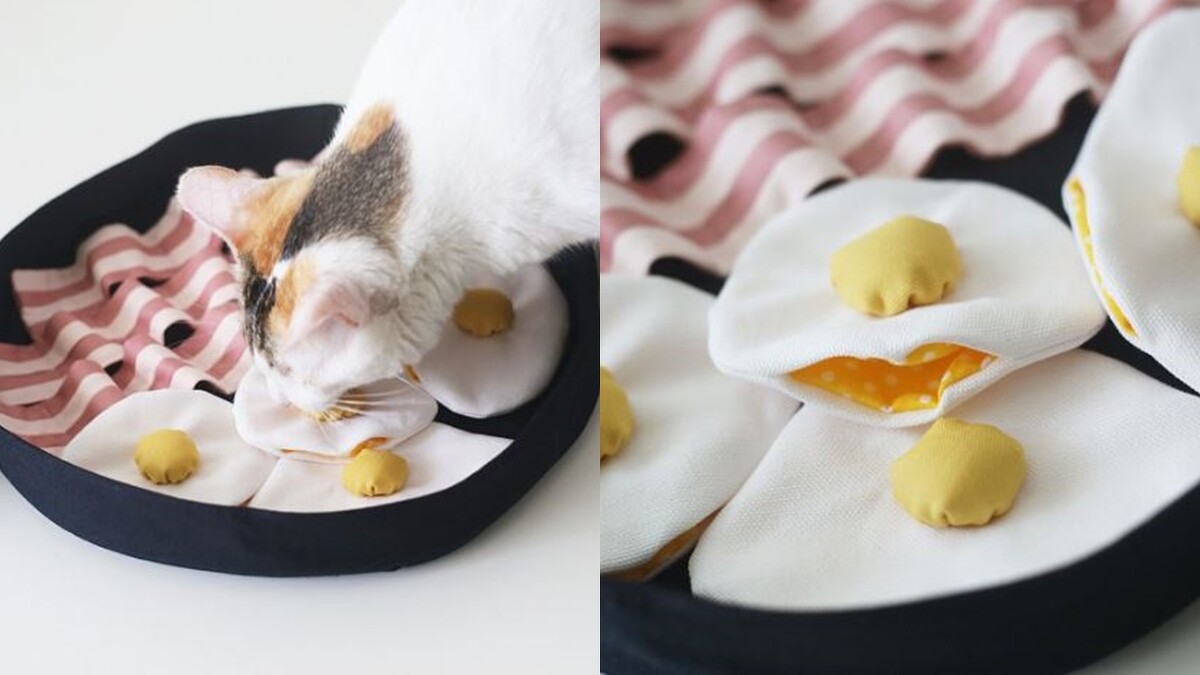 每次都要陪主子玩好一會兒實在太費時,快買這款「鐵鍋培根蛋」給牠們挑戰!30公分直徑的鐵鍋裡擺放三條培根、四顆蛋,共有20處可藏匿點心,也是絕佳消耗體力的玩具。建議要不時手洗清潔,才能保持新鮮感。