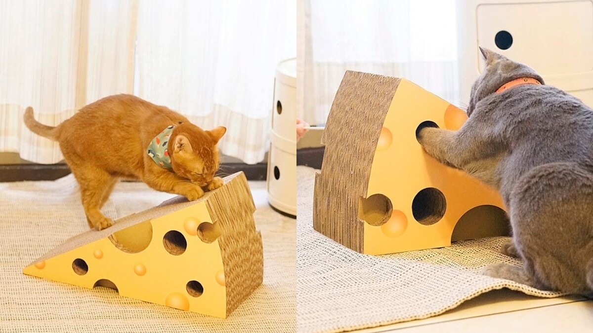 喜歡跟貓咪一起玩的人,又有全新玩具選擇!這款經過寵物行為訓練師認證的「起司益智抓板」,手製作做的超大塊起司造型抓板,譨滿足貓咪喜歡抓獵物的好奇心。用逗貓棒、塞乾零食在洞口,還能讓貓咪磨爪,可說是相當實用。