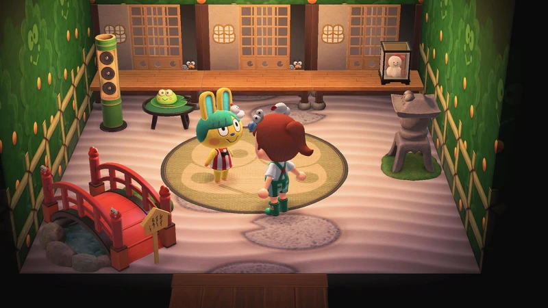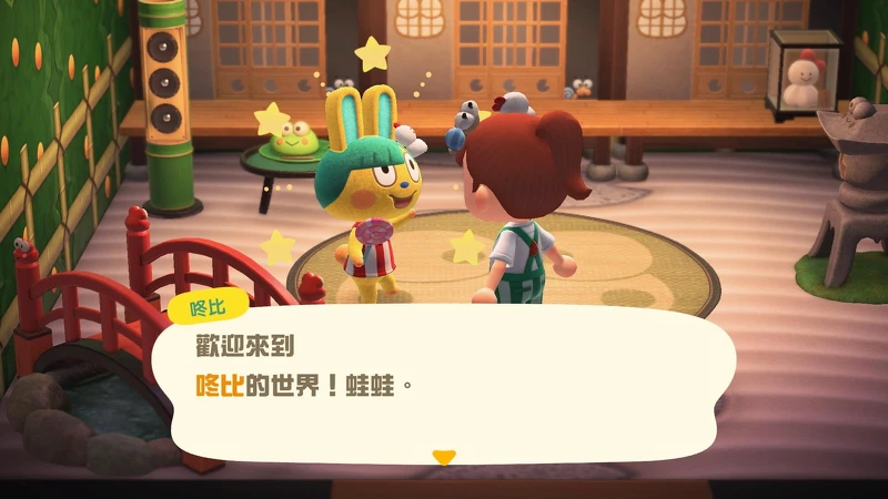 大眼蛙線香盤、荷葉造型桌子,大眼蛙造型石燈籠、紅色拱橋、日式長椅、大眼蛙拉門壁板、晴天娃娃擺飾品、壁紙、地板、地毯