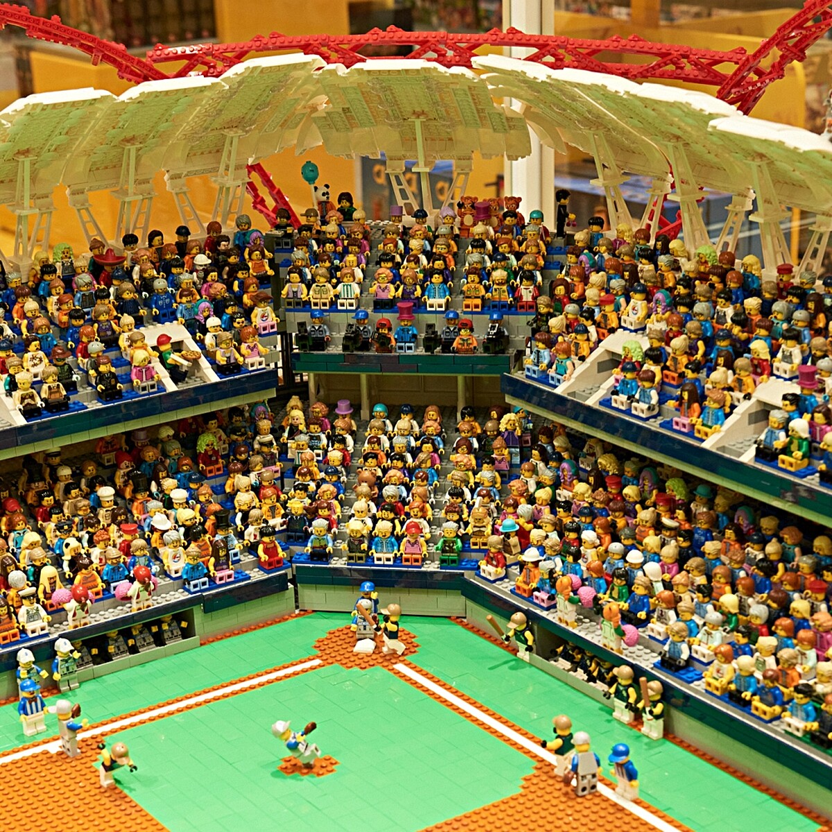 另外一個則是從盛行棒球運動的風氣出發、在專賣店中重現「台中洲際棒球場」!耗時3個月打造,總共加入2000隻樂高造型小人偶,並神還原美式風格的天篷與看台。細節也不容錯過,像是球場外圍的紅色鋼架設計,象徵照棒球縫線;看台上還有小豬人偶排列出「Ilove Taichung」加油隊形。