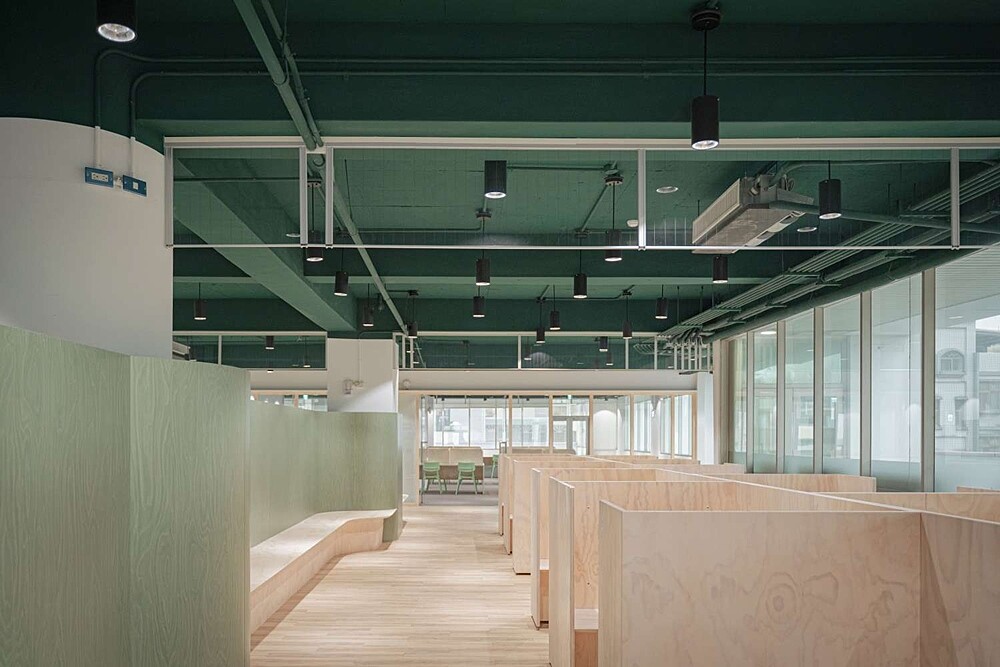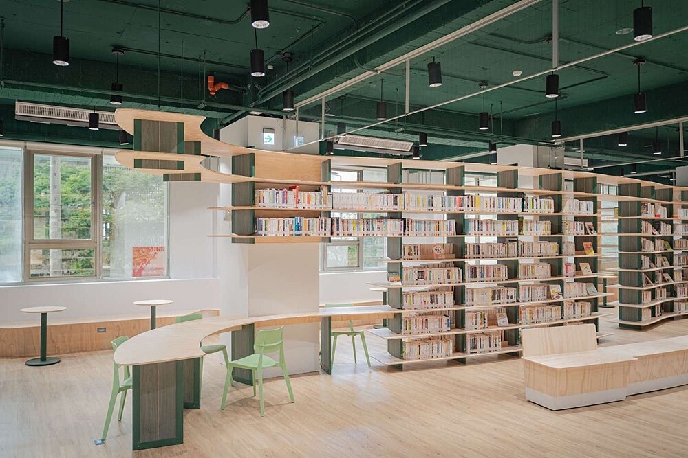 全館以「森林」為設計概念,讓圖書館化身城市中的「閱讀森林」,天花板以綠色妝點,與簡潔線條的木架層板,交織出令人心儀舒適的空間美學。2樓有用山丘、梯田地形規劃的閱覽區,是專為親子打造的溫馨閱讀空間;3樓是能視聽閱覽、自修及討論的靜謐空間;4樓則用開架式層板作為藏書森林。
