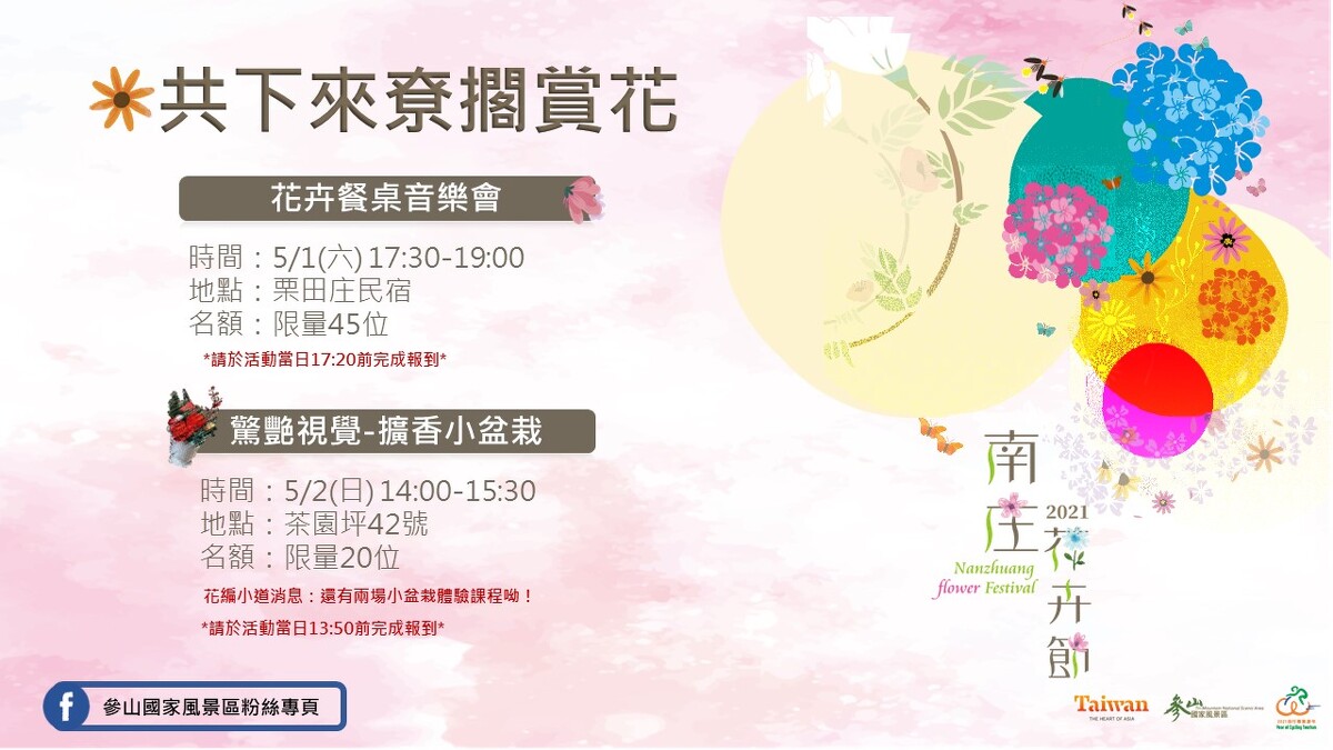 交通部觀光局參山國家風景區管理處主辦的「2021南庄花卉節」即將在5/1於栗田庄民宿舉行,屆時在苗栗南庄的大街小巷,將有繽紛夢幻的花藝造景,而在長達一個月的活動期間,結合了「音樂展演」、「花卉布置」、「戶外餐桌」等三大浪漫元素,每個週末更會不間斷地舉辦豐富的花卉節系列活動。