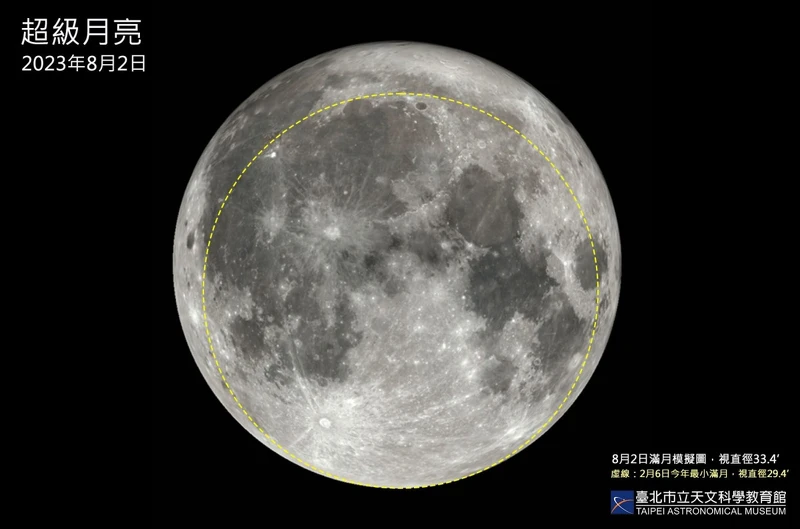2023年「超級月亮」發生在8/2日,會在2點32分達到望的位置,地球與月亮距離為357,528.1公里,符合36萬公里以內的「超級月亮」定義,成為今年首次超級月亮。相較於2/6的最小滿月來比,視直徑大了13.5%、面積增加28.8%,會是很明顯的又大又亮滿月。錯過了沒關係,8/31還有下一次「超級滿月」,而只要發生在同月第2次滿月就是「超級藍月」。
