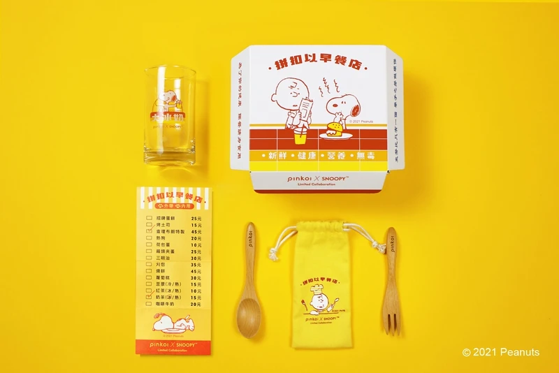 延續上次具有「台味」的道地設計,第二彈聯名同樣有台灣人都不陌生的經典元素在內!這回選用台式早餐店的紅黃配色設計餐具組,裡頭包含早餐包裝盒、高球杯、純棉束口袋、餐具組、菜單等,並巧妙將查理布朗、史努比圖案融入其中,宛如陪伴你喝大冰奶、吃早餐,為每個早晨注入滿滿活力。