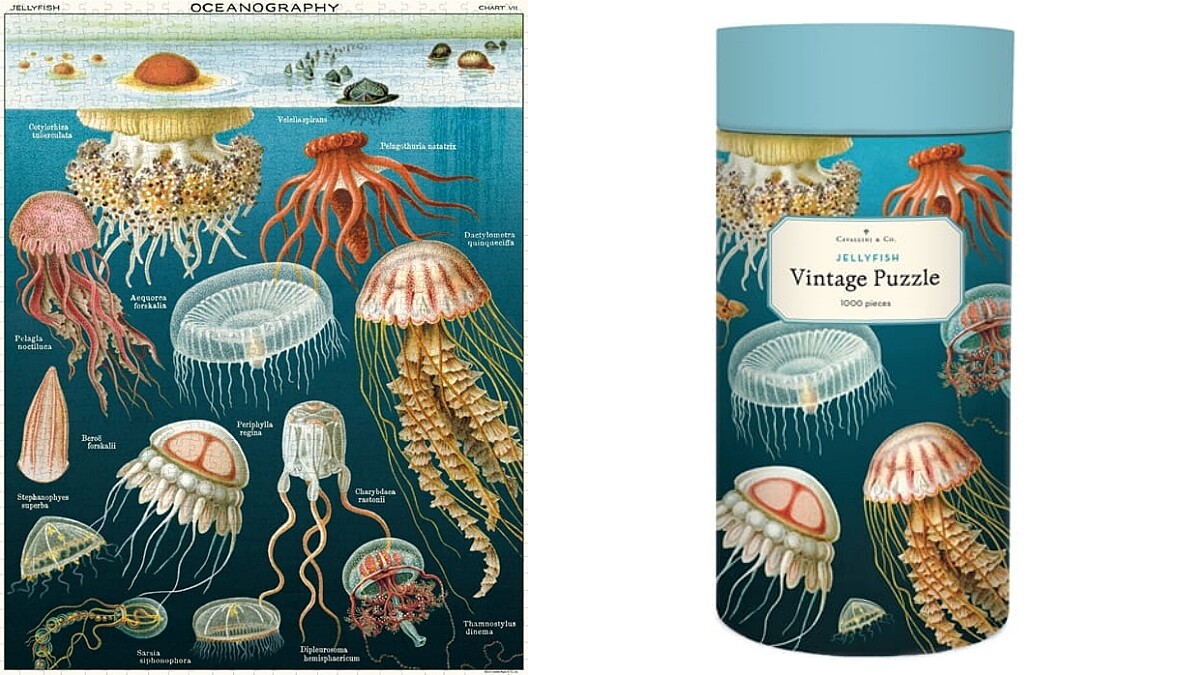 來自舊金山、創立於1989年的美國文具品牌Cavallini & Co.,創辦人Brad Parberry將某次探訪義大利祖母時,將她大量中古印刷蒐藏化為靈感,把美式復古元素結合義大利高級紙材,推出令人傾心的高品質文具禮品。博客來上販售2020年起開賣的拼圖系列,除了有海底水母,還能找得到蜜蜂、蝴蝶、奧杜邦島等多款選擇,拼完後立刻為居家增添文藝氣息。