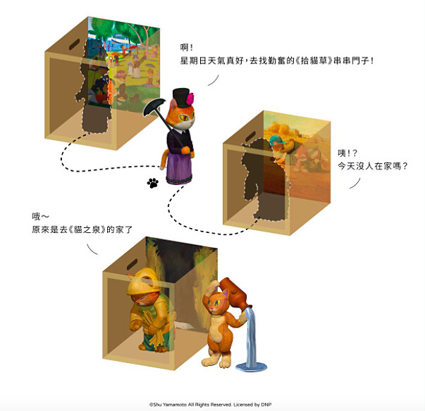 貓娜麗莎、戴珍珠耳環的少女貓、貓之泉、拾貓草、大碗島的貓咪午睡等經典貓名畫,將立體化完整呈現360度的貓咪全貌。