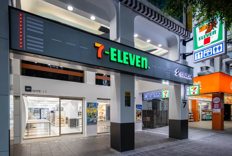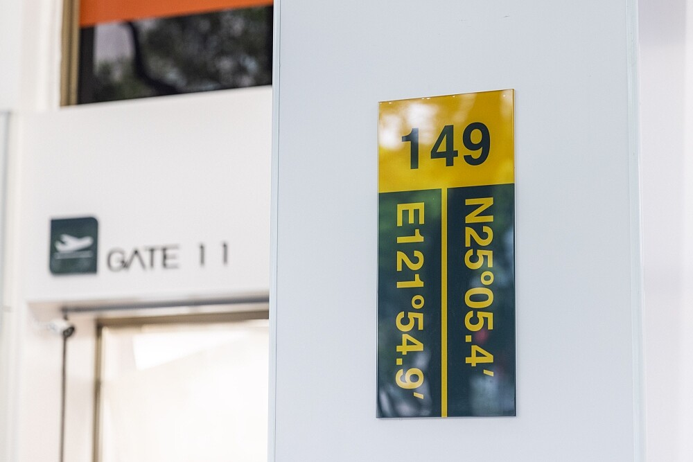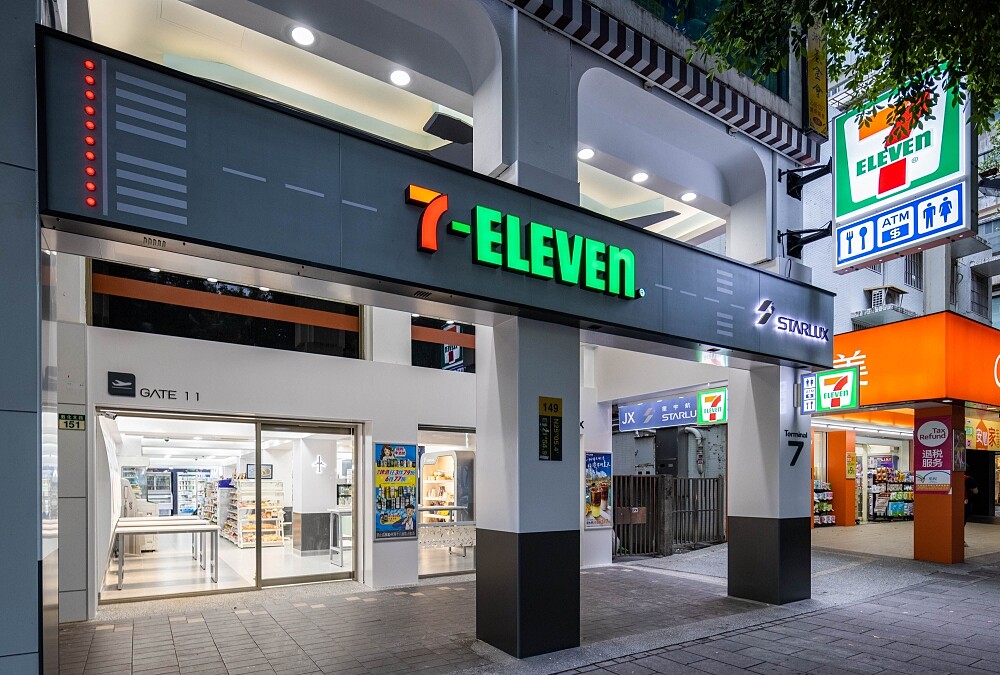 光是外型就顛覆你對7-11的想像!以機場航廈做為視覺設計,將機場跑道作取代紅綠線條背景,柱子上將門市座標用「經緯度定位」呈現,還放上大大的第7航廈(Terminal 7)、大門上方的11號登機門(GATE 11)標示,帶領大家展開一段航空之旅。