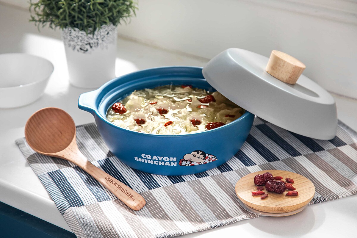 日式簡約陶瓷燉鍋,附木製湯勺,鍋身適用於瓦斯爐直火加熱、黑晶爐、電陶爐,讓煮飯更增添儀式感。