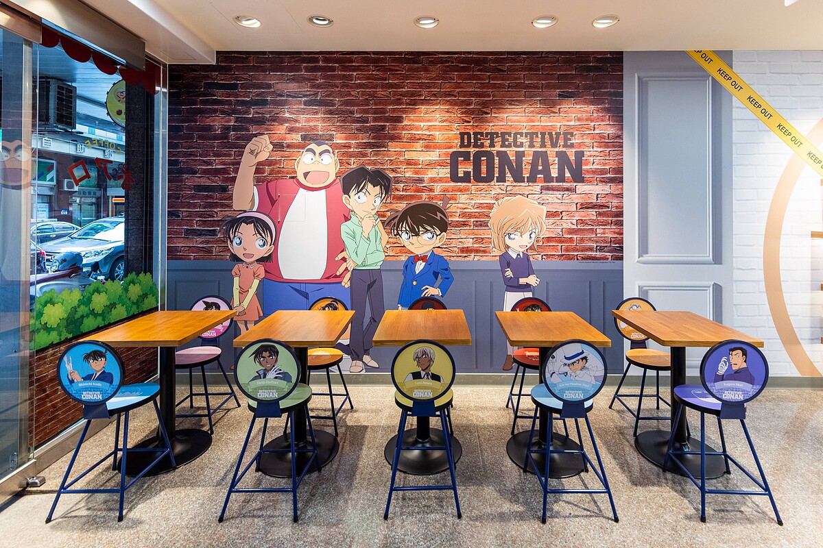 在店外重現經典人氣場景波羅咖啡廳,掛上了名偵探柯南主題店招,玻璃窗貼上更有江戶川柯南及毛利蘭兩大主角迎賓,讓大家一秒進入名偵探柯南的世界!