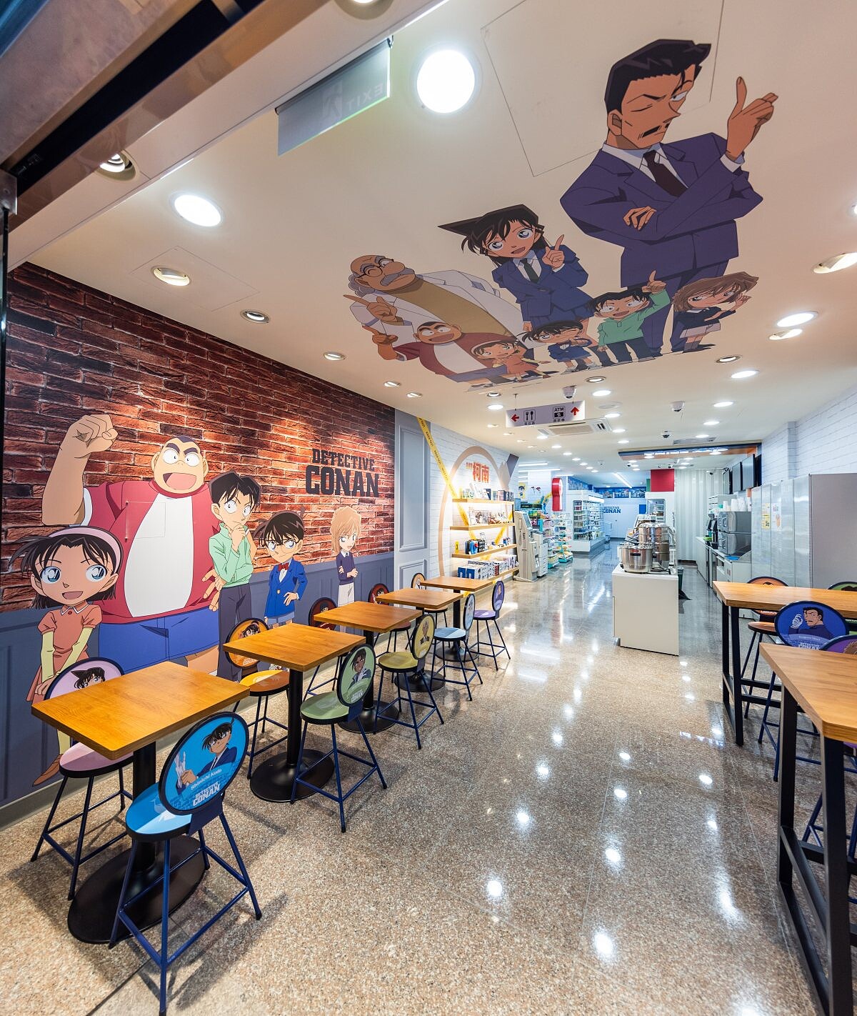 牆面上印有高達230cm的少年偵探團打卡牆,天花板除了少年偵探團外,更有毛利小五郎、毛利蘭以及阿笠博士..等經典角色迎接粉絲的到來。