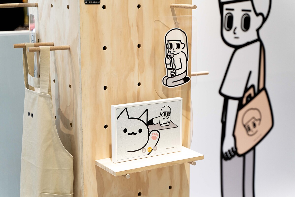 名為《一起和消極男子過夏天》的展覽中,除了可以看到「消極男子」筆下人物的日常生活情境景,還分別與第六市場冰穀咖啡及上好生醫科技合作打造全新周邊品項,包括馬克杯、陶瓷杯墊、紙膠帶到帆布包通通有。
