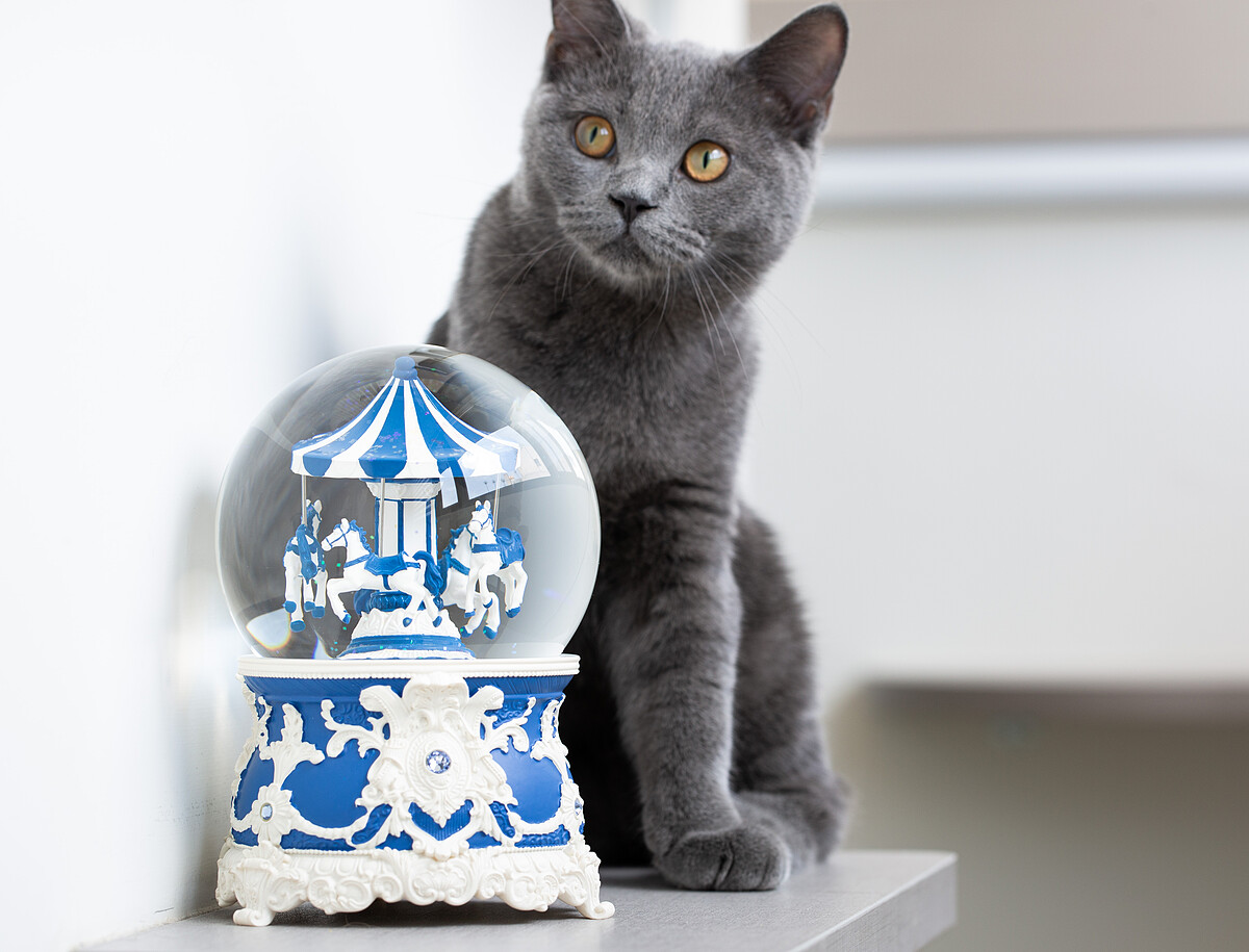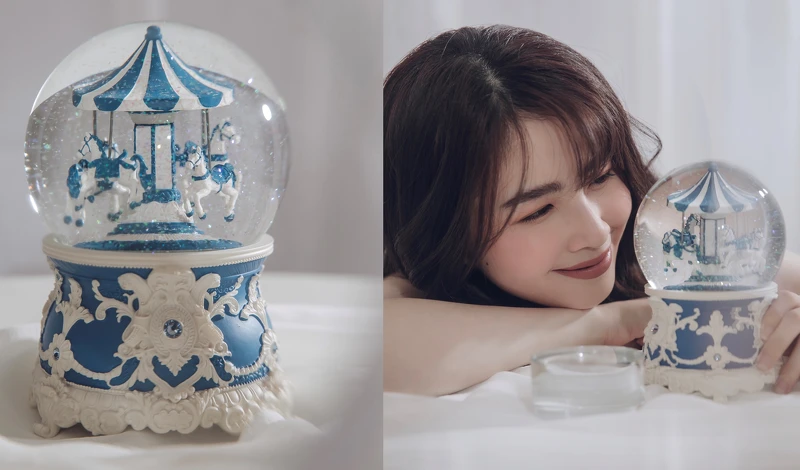 貴族寶藍色的盒身上佈滿著超美的歐式捲草紋雕工細節,還能隱約透露出施華洛世奇的水鑽光澤顯得相當有質感,水晶球內是同色系藍白相間的旋轉木馬,有點個性也有點夢幻,因為擁有這樣反差的魅力,這款夢幻水晶球想推薦送給外表自信亮眼,內心又不失個性天真的女孩。