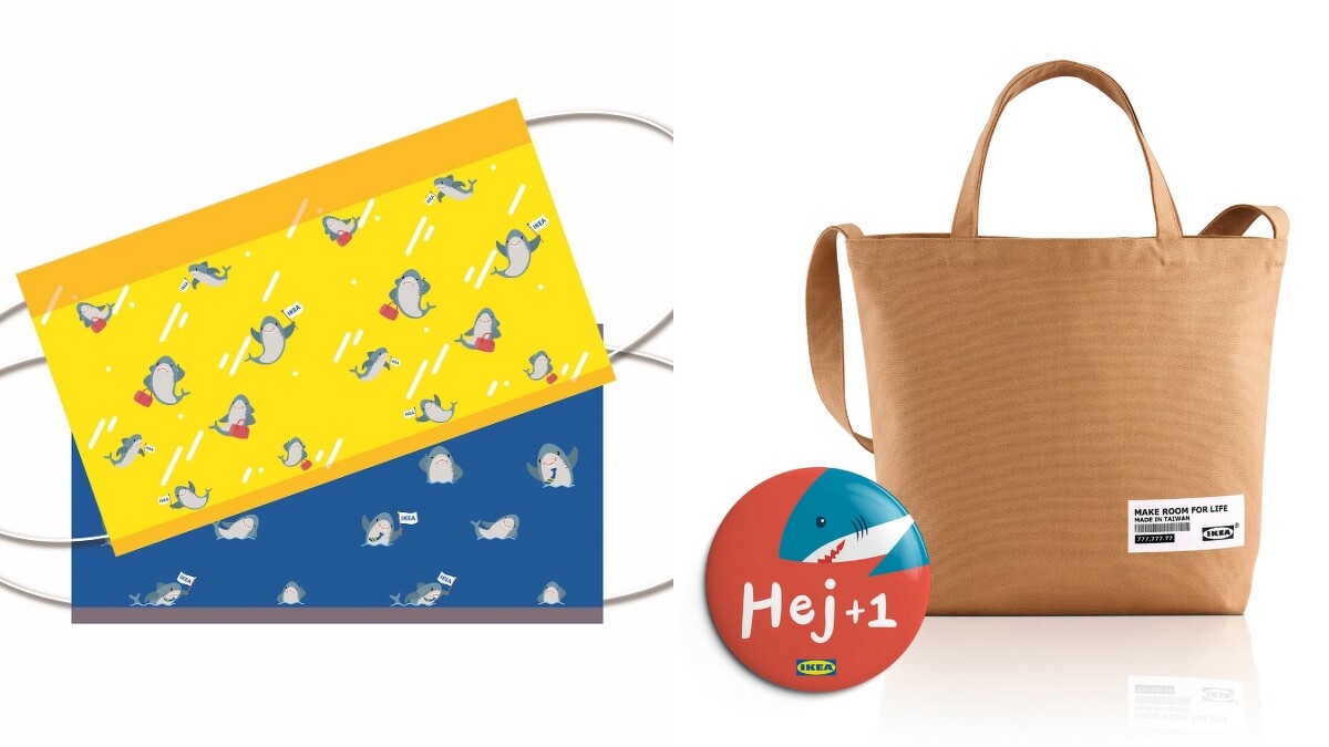 為了慶祝「IKEA Hej行動商店」9/8開幕,只要在9/8~9/15消費,便會贈送「超萌鯊魚口罩乙組」(僅限量1200組);若消費滿660元,更會送限量帆布包及造型徽章乙個。還有「見面禮」則是加入宜家卡卡友,就會送「小藍袋零錢包」一只。