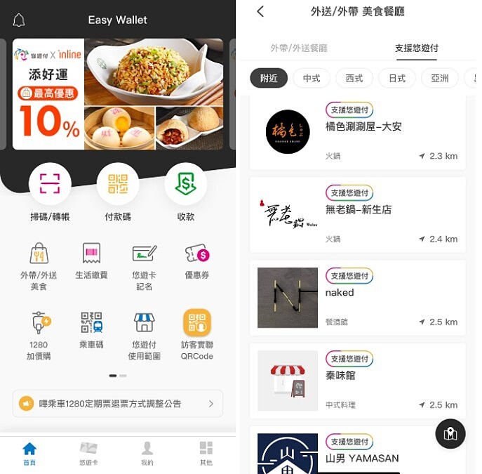 進入悠遊付APP後,便會看到外帶/外送美食選項,頁面上更是隨時會出現相關的優惠活動訊息,一目瞭然相當清楚。