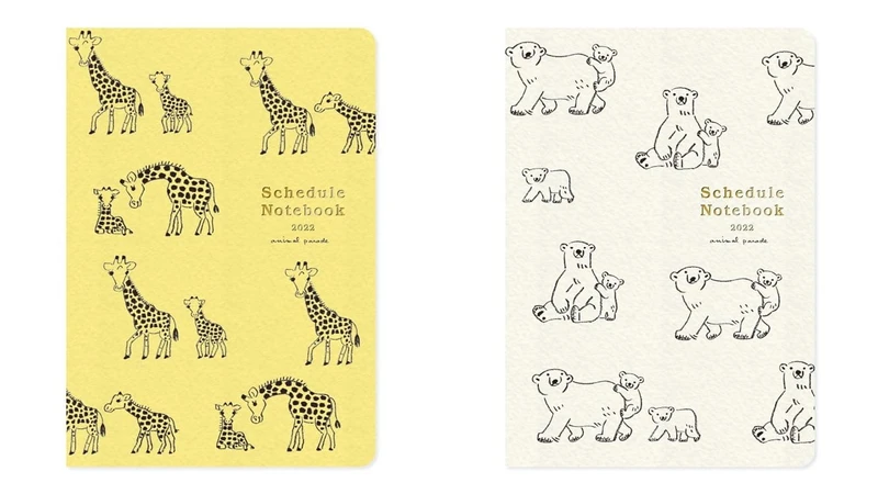 插畫家中島良二所繪製的animal parade系列,每年都以可愛動物療癒使用者的身心!2022年以「動物遊行」為主題,共推出北極熊、長頸鹿、恐龍、刺蝟等4款,並分別用粉紅、綠色、黃色與白色設計外觀。內頁中的每日格子用細線隔開,可以區分上下午或公私事,更有「動物棲息地圖」與貼紙,前頁與後頁更藏有可愛細節,讓你時時都有好心情。