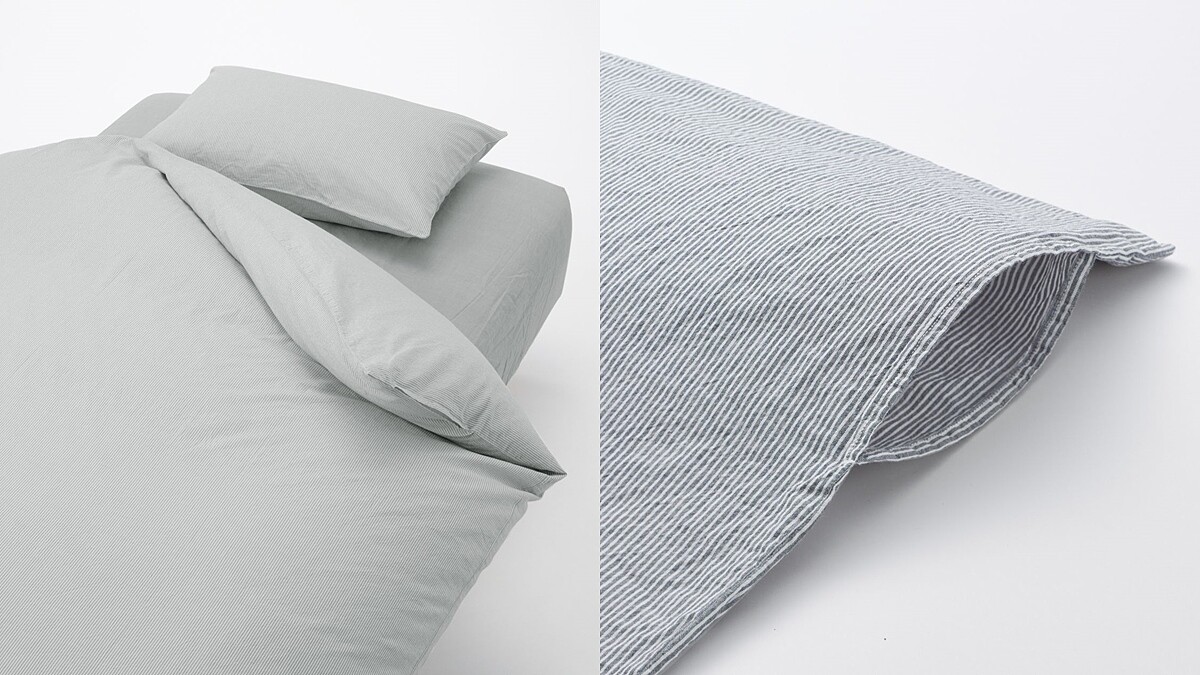 同樣是以有機棉製成的「柔舒水洗棉被套」,樸實風格能輕易融入臥室佈置中。有淺棕直紋、深藍直紋、淺米直紋、灰直紋、原色、灰色、淺米色、深藍色多款選擇。