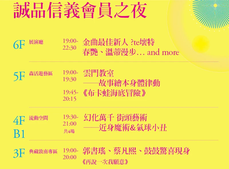 下周五(9/24)請把時間空出來!誠品信義店舉辦年度會員之夜,將會舉辦超過20場藝文表演,紓壓之餘還能體驗「誠品線上實體快閃店」商品,表演時刻表也整理好了。