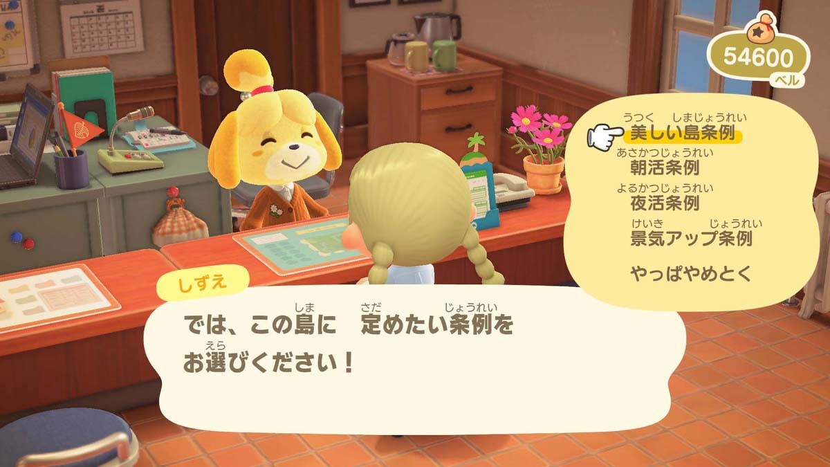 玩家可以制定不同的島嶼條例,例如早鳥條例,就是讓島上居民可以提早開始一整天的活動,讓島民們可以配合玩家的生活作息!