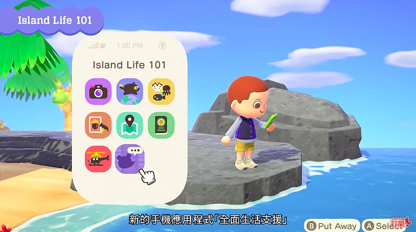 手機照相機應用程式功能升級,玩家可以切換至手持照相機模式,鏡頭會配合玩家視角調整角度;切換成三腳架相機,玩家就可以與島民或是NPC合照啦!